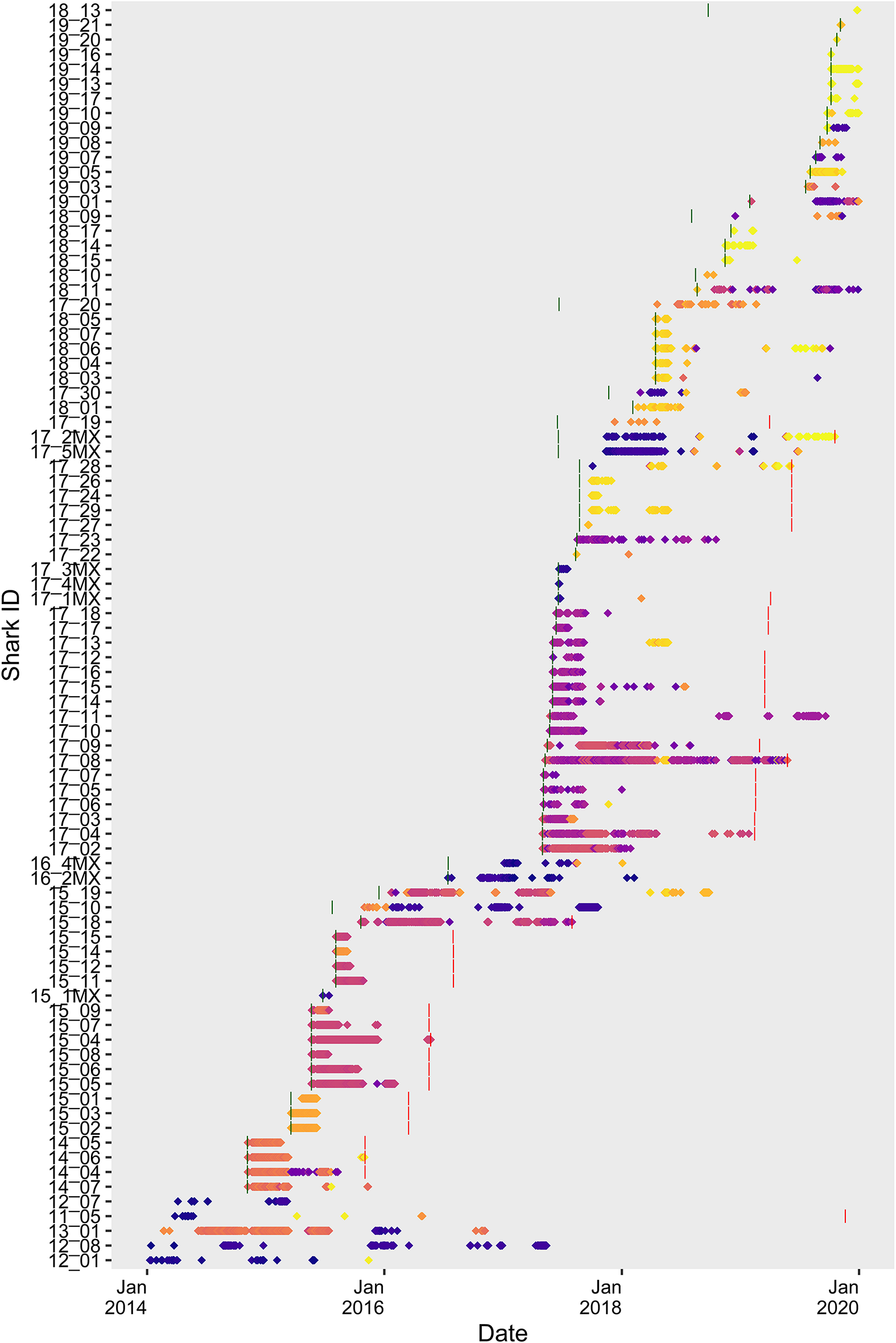 Time series plot showing presence/absence of tagged juvenile white sharks at monitored locations. Points are colored according to individual receiver station latitude demonstrate co-occurrence. Latitudes corresponding to point color are shown in Figure 1. Green and red vertical lines show tagging date and tag-battery life, respectively. Sharks with bars missing were either tagged prior to 2014, or tag-battery life extends beyond 2019.