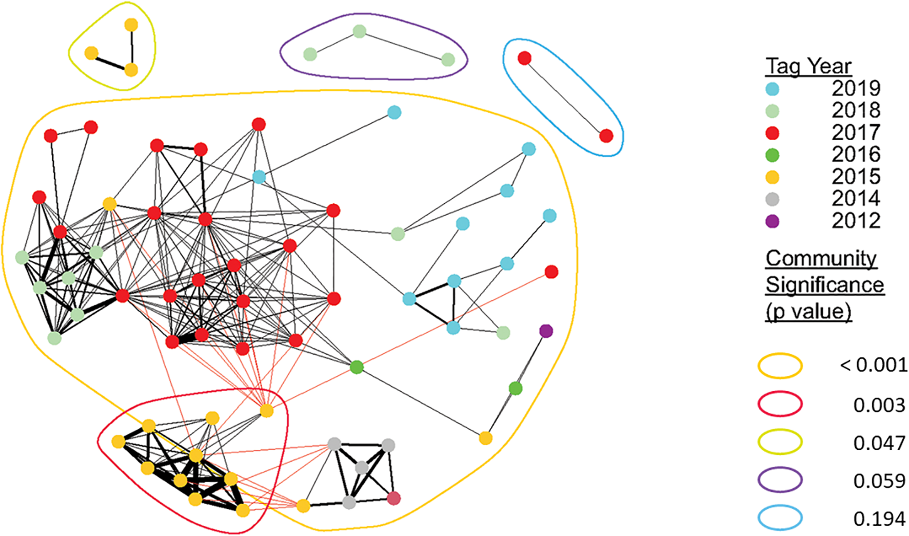 Sociogram showing associations of all tagged juvenile white sharks across all years. Nodes represent individual sharks, node color indicates the year in which they were detected or formed strongest associations (in the case of sharks detected over more than year). Edge thickness indicates the relative number of connections (associations) between nodes. Colors encircling multiple nodes represent identified distinct communities. Detected sharks that did not form dyadic connections to at least one other tagged shark (n = 31) are not shown. Community modularity for all detections across all years was high (Q = 0.63), which reflects that although communities appear to be connected, they were spatiotemporally distinct with limited individual connections to other communities.