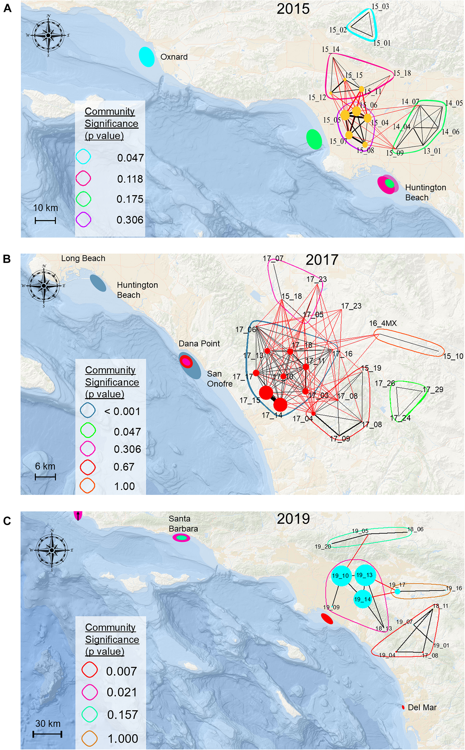 Maps depicting community modularity in observed networks for 2015 (A), 2017 (B), and 2019 (C). Community composition and corresponding discrete spatial locations of specific network communities are reflected in coloration of bands surrounding network nodes, and oval shaped markers within map coastal locations.