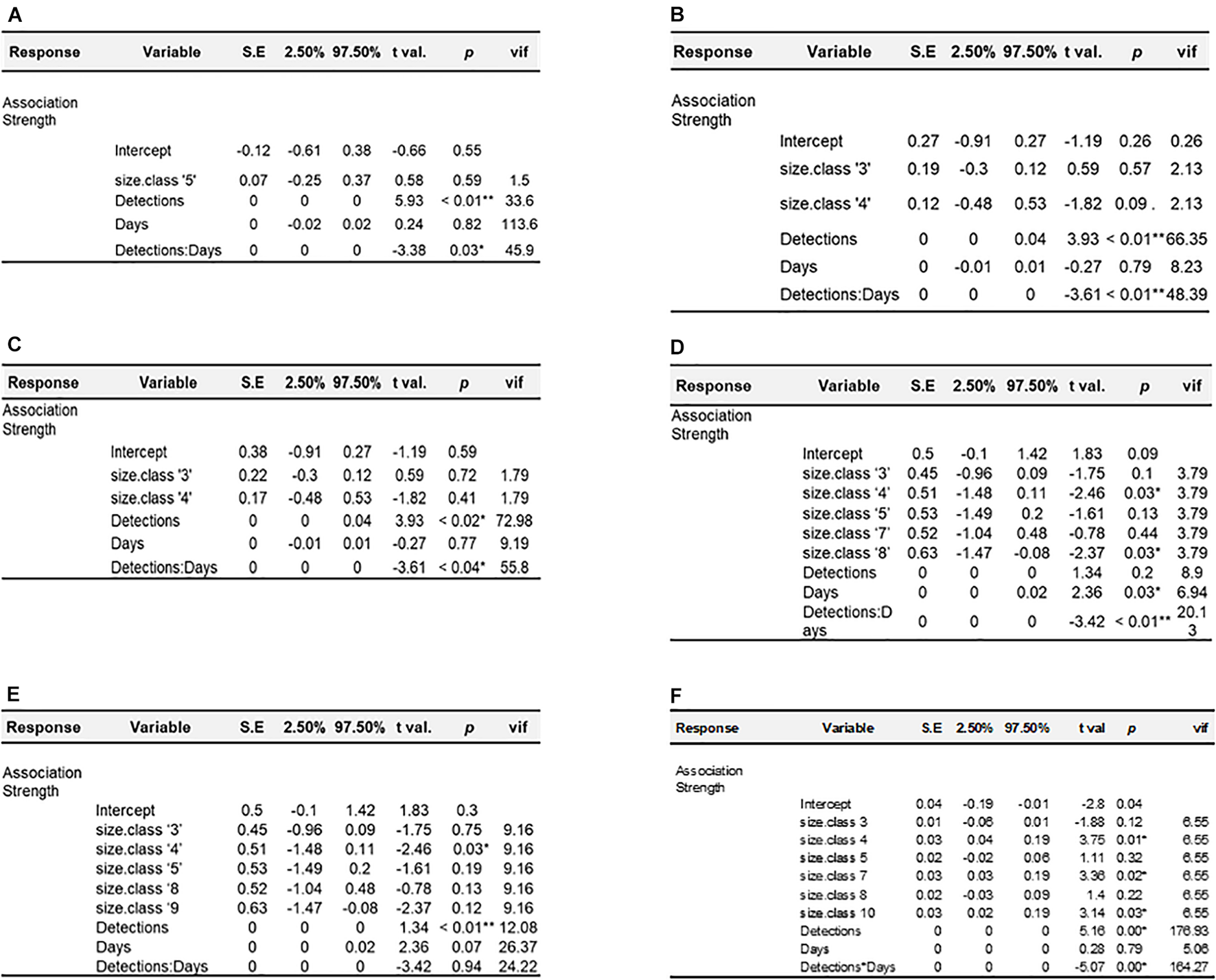 General linear models were run for each year in the dataset to examine potential predictors of association strength. For all years, the best fitting model was strength ∼ size class + detections∗days (Figure 5 and Supplementary Table 3). The interaction term of detections∗days was significant in all years for which it was included, except for 2018, where the interaction was not significant and these terms were removed, and the model re-run (Carey, 2013). Model correlation coefficients ranged from 0.19 to 0.83 (0.52 ± 0.23). The interaction term and response variable (association strength) were found to be strongly collinear across all models where included and is reflected by high associated variance inflation factors (Figure 5). Shark size-class was included in all final models, and was found to be a significant predictor of association for 3 of 6 final models [2017, 2018, and 2019 (Figure 5)]. The results from MRQAP-DSP regression indicated that shark size-class was a significant predictor of co-occurrence in 3 of 6 yearly datasets examined (2015, 2017, 2019; Table 3). Tagged shark co-occurrence was found to be significantly correlated with shark size-class in those same years [Mantel tests: (2015) r = 0.332, p = 0.001; (2017) r = 0.08, p = 0.04; (2019) r = 0.144, p = 0.014; Table 4].