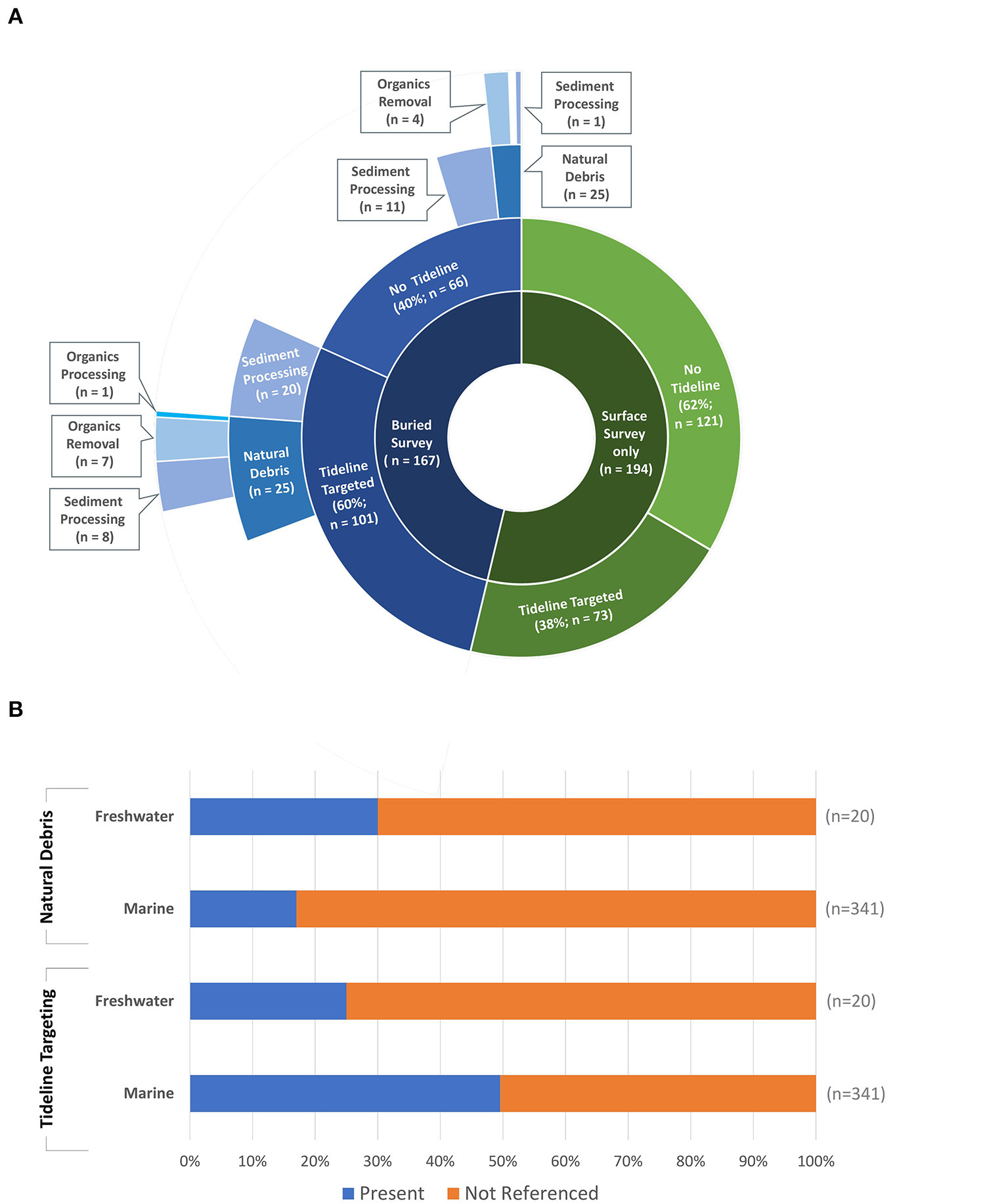 (A) Methodological breakdown of tideline targeting and treatment of organic material in 361 studies. Some studies included both buried and surface surveys, these studies were counted under the “Buried Survey” category. [A single study can qualify for more than one category where multiple treatments of organic materials were employed]; (B) Acknowledgement of tideline targeting or natural debris at sample sites from marine and freshwater studies. Any study that included at least one freshwater sample site was counted as a freshwater study. See Table 1 for more information on the classification system for treatment of organic material referred to here.
