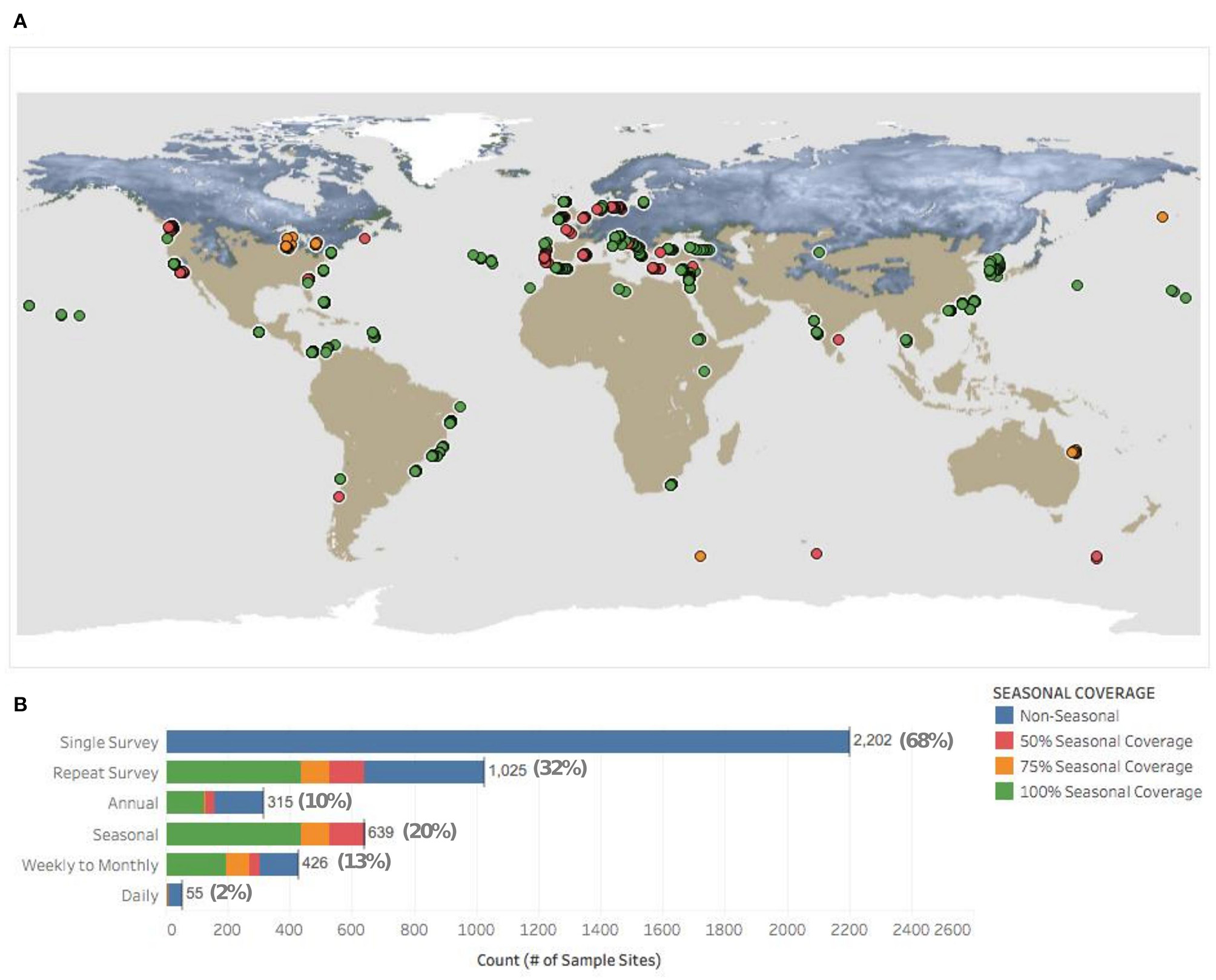 (A) Distribution of survey sites sampled in more than one season overlaid on NASA Earth Observations snow water equivalent map layer; (B) Counts of sample sites subject to different survey frequencies. Proportions are calculated from total number of sample sites. A single sample site can qualify for more than one frequency category (i.e., “Weekly to Monthly” and “Seasonal”). Map source: NASA Earth Observations (NEO).