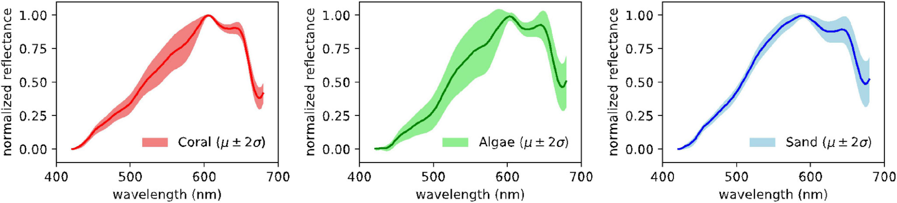 Each material reflects, emits, or absorbs light in unique ways throughout the electromagnetic spectrum. The measured signals are called spectra and contain recognizable features or patterns that can be used for composition analysis. The CORAL mission focused on coral, algae, and sand as the most common, widespread, and important types of benthic cover. We preserve that taxonomy in this study for simplicity. Figure 2 shows benthic functional type derived from spectra of coral, algae, and sand collected by PRISM during the CORAL mission.