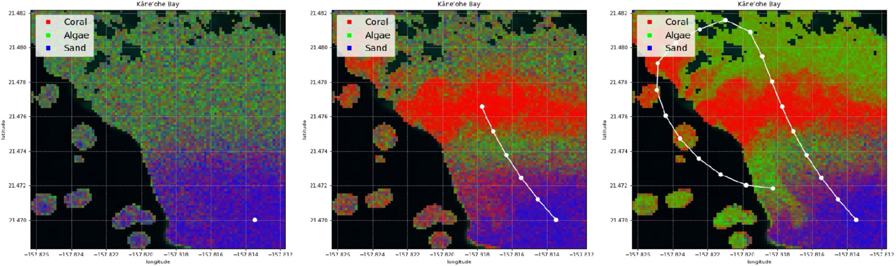 Example of our active process for coral reef mapping applied in Kaneohe Bay, Hawaii. The CORAL mission focused on shallow water areas, and thus a mask (as shown in black areas) is applied for depths greater than 5 m within the subsetted scenes. Experience with the CORAL data suggests that the accuracy of the standard coral, algae, and sand estimation degrades below 5 m depth. For the purposes of this paper, we focus on shallow water areas with plenty of signal. The mapping process starts with poor predictions (left). Just a few in situ samples are extrapolated throughout large areas with the assistance of remote sensing (center). The predicted coral reef map improves as more samples are collected (right).