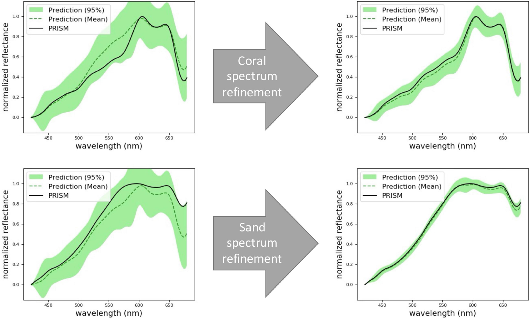 Prediction of coral (top row) and sand (bottom row) spectra at two locations that are never actually sampled. Here we use PRISM as the ground truth. At first, the model’s predictions have a low accuracy and a high uncertainty (left column). After collecting more samples, the model refines its spectral predictions (right column).