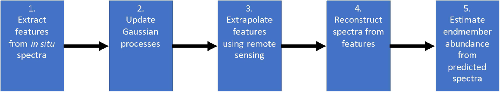 Overall, our approach consists of two steps: spectral mapping and endmember mapping. First, we use remote sensing as a prior to extrapolate high-resolution in situ spectral measurements over large areas (Figure 4). Then, we utilize the predicted high-resolution spectra to estimate endmember abundance via spectral unmixing. We decouple these steps to allow for alternative spectral unmixing techniques. Specifically, both spectral and endmember mapping are achieved by combining different probabilistic machine learning algorithms. Gaussian process (GP) regression has been widely used in spatial statistics (Cressie, 1993; Rasmussen and Williams, 2006), adaptive sampling (Krause et al., 2008), and autonomous robotic exploration (Thompson, 2008; Kumar et al., 2019). However, most work regarding GPs (especially for AUVs) involves mapping scalar fields such as salinity, temperature, altimetry, or dissolved oxygen measurements (Binney et al., 2010; Flaspohler et al., 2019; Stankiewicz et al., 2021). In contrast, our goal is to learn and map non-scalar data, i.e., high-resolution spectra. We tackle this problem with feature extraction techniques, which reduce the dimensionality of spectra by deriving a subset of non-redundant features. Feature extraction approaches have been used for (non-scalar) benthic habitat mapping (Rao et al., 2017; Shields et al., 2020). Nonetheless, they use deep learning architectures instead of GPs for spatial modeling, thus complicating the implementation of true adaptive sampling for real time applications. Once our model predicts spectra from features, we utilize learning-based spectral unmixing algorithms to estimate endmember abundances from spectra. Figure 5 shows a summary diagram of our approach. The rest of this section describes spectral feature extraction, Gaussian process regression, and learning-based spectral unmixing in more detail.