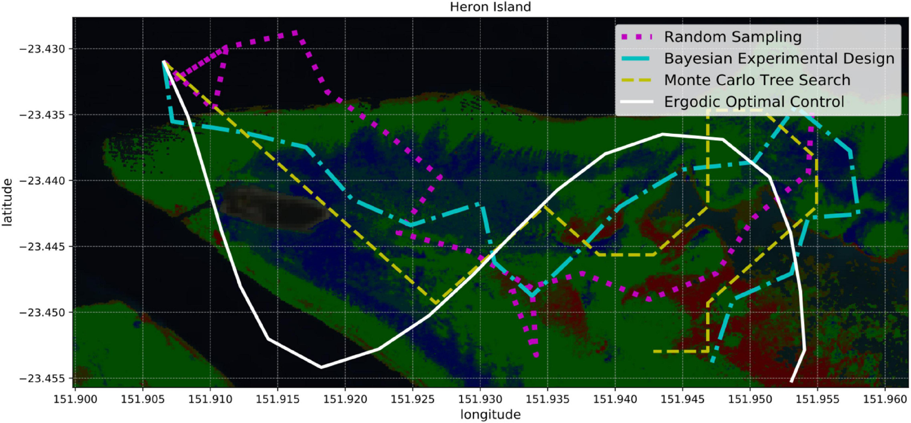 Four sampling strategies for coral reef mapping: random sampling, Bayesian experimental design, Monte Carlo tree search, and ergodic optimal control. Random sampling is the simplest approach since it ignores how useful future samples might be. Bayesian experimental design provides a probabilistic framework for identifying the most informative samples and planning paths accordingly. Monte Carlo tree search combines random sampling with a tree search that focuses on the most promising actions. Ergodic optimal control not only selects informative samples, but also generates smooth trajectories that can be suitable for boats or AUVs.