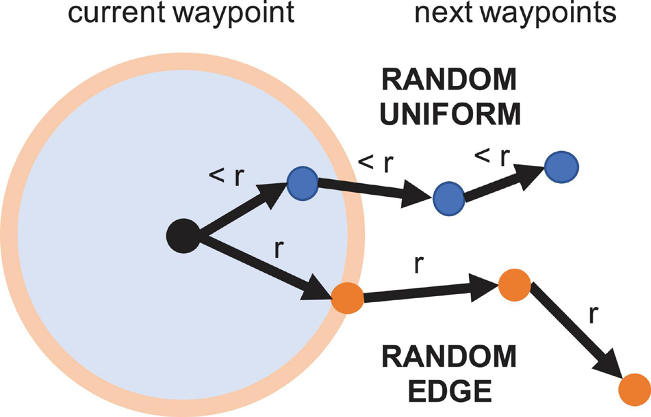 Visualization of the random sampling strategies. Random uniform selects any point inside a local region defined by a fixed radius r. Random edge selects any point along the region’s perimeter, potentially increasing traversed distance and coverage.