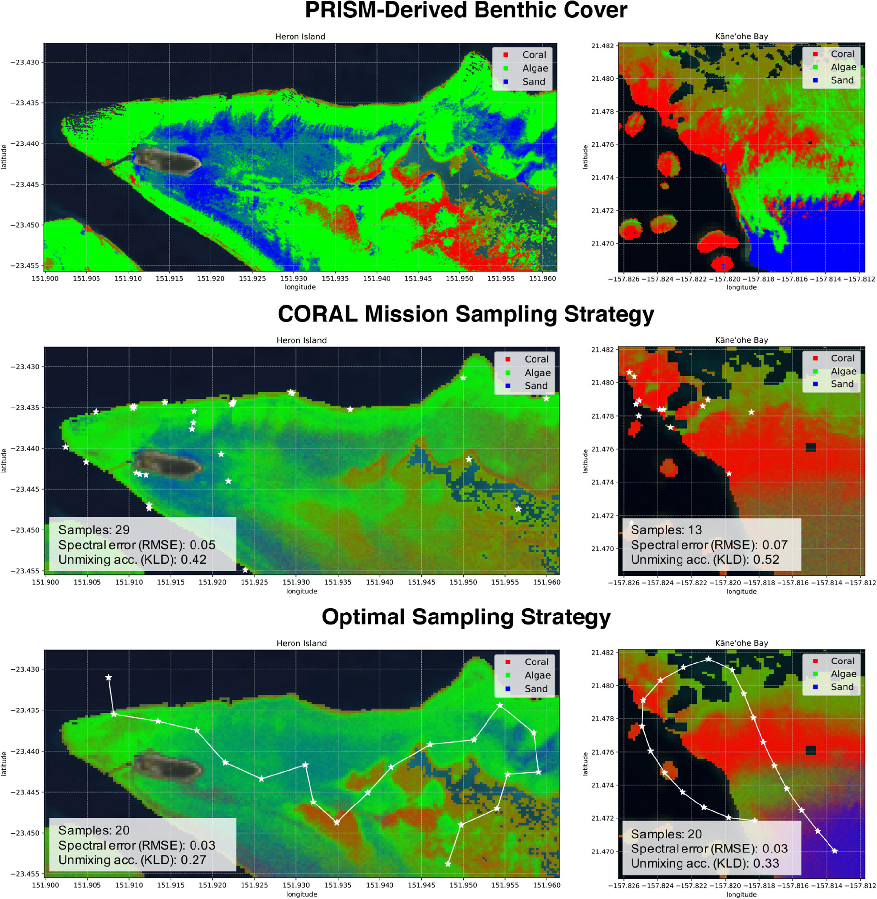 Benthic functional type corresponds to probabilities associated with coral, algae, and sand for each seafloor pixel, and was determined by logistic regression using mean reflectance spectra from an existing spectral library (Hochberg and Atkinson, 2003; Hochberg et al., 2003). We acknowledge that additional benthic functional types could be distinguished from the PRISM dataset with utilization of other spectral libraries, but the focus of CORAL – and thus this work – was on coral, algae, and sand. Examples of PRISM-derived benthic composition from the CORAL mission are shown in Figure 1, with each pixel representing the primary benthic functional type (i.e., greatest percentage of one type per pixel, wherein all types sum to one per pixel). Herein we evaluate PRISM-derived benthic reflectance since it provides invariance to water column properties. Utilization of in situ measurements of benthic reflectance are preferred; however, there were no coincident collections of such measurements with overflights under cloud-free conditions. Maps of PRISM-derived benthic composition (i.e., coral, algae, and sand) are used to validate our mapping/sampling results, serving as “ground truth.” Note that PRISM-derived products were validated by an extensive field collection as part of the CORAL mission and is not the focus herein (e.g., Thompson et al., 2017). For example, PRISM-derived benthic composition maps were validated by 10 m × 10 m photomosaics collected in the field at random. In each 10 m × 10 m plot approximately 500–1000 digital photographs were taken, mosaicked using structure-from-motion techniques (Agisoft Metashape) to provide a single orthomosaic, and then analyzed using coral reef science standard point-count methods to provide proportional benthic composition for benthic functional types.