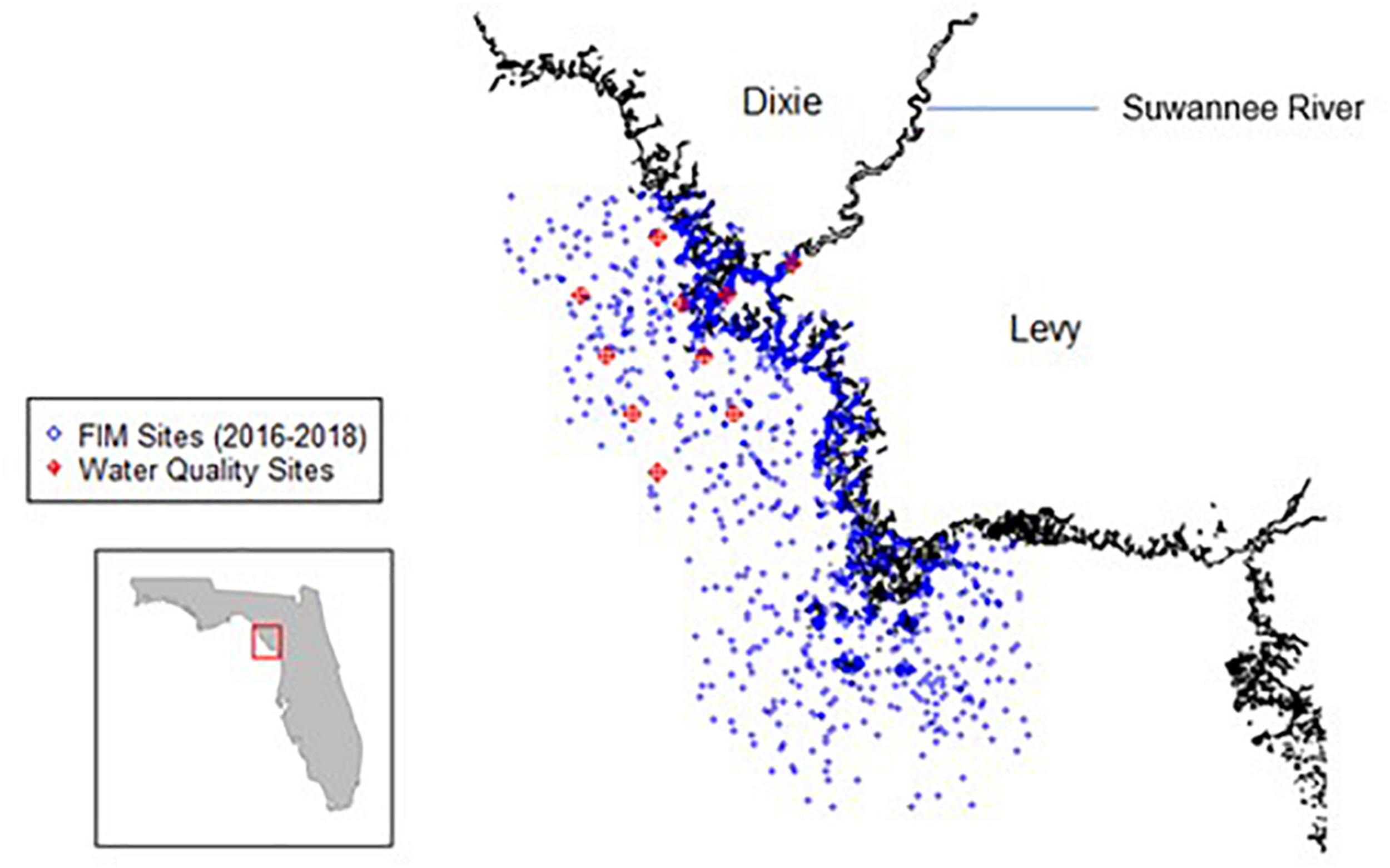 Map of the Suwannee River Estuary. FIM sampling locations from 2016 to 2018 are in blue, and Project COAST water quality sites are in red (Florida Fish and Wildlife Conservation Commission, 2021; Frazer, 2018).