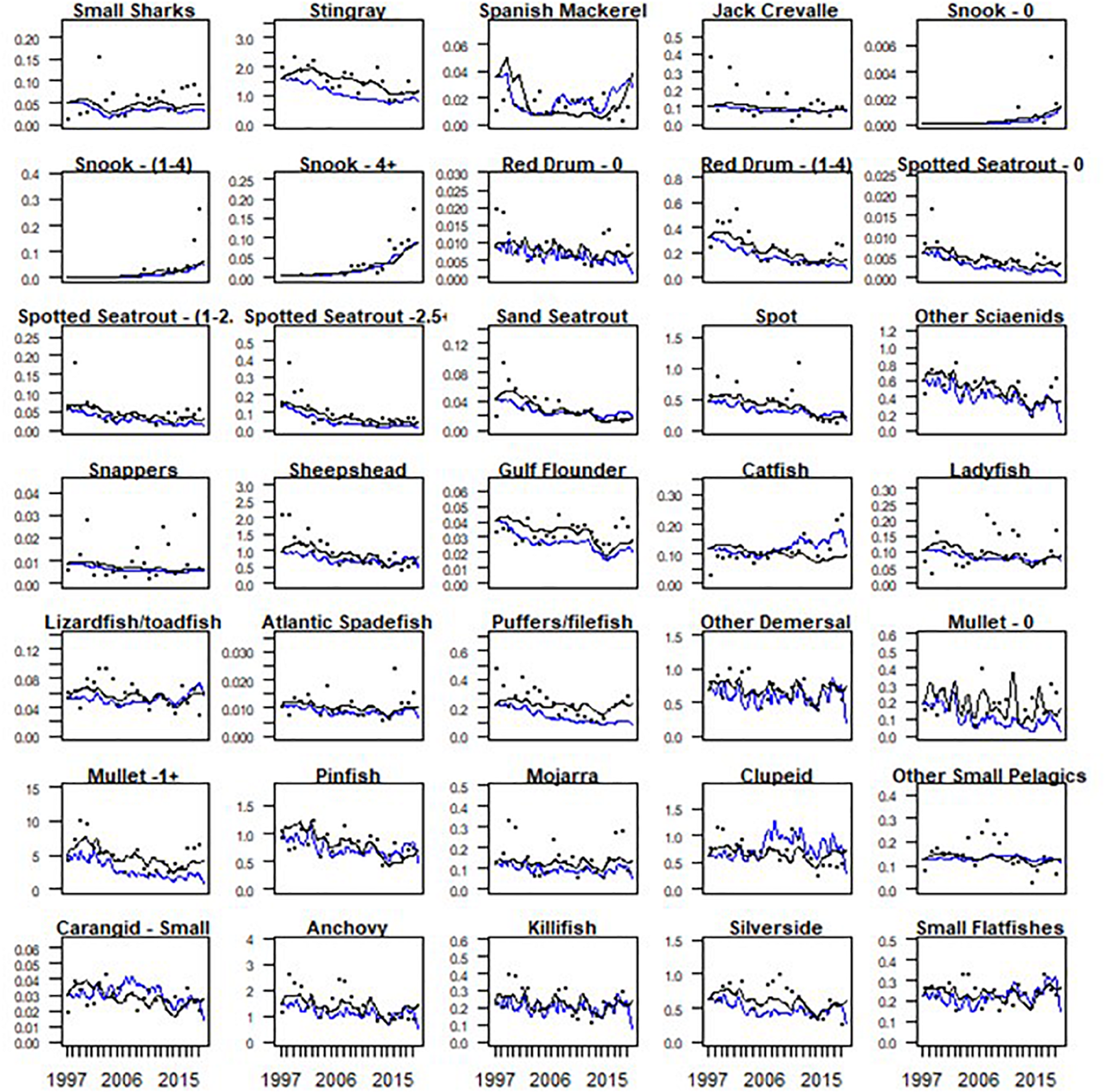 The Ecosim analysis sought to fit model predictions to time series of relative abundance for various model trophic groups. We began by assembling a reference time series of biomass and landings estimates, as well as fishing effort and environmental forcing time series. Annual indices of abundance for fish functional groups were estimated from the FIM data using delta generalized linear models (GLM) (Lo et al., 1992; Maunder and Punt, 2004). The use of GLM’s was necessary to standardize across gears and habitats, as some species were more adequately sampled in certain habitats, months, or with certain gears, as opposed to other species. In delta GLM’s, a model of log-normal values of biomass densities from positive sets was first fitted, followed by a binomial model for the probability of occurrence. The product of the least squared means for each year from the two models was taken as the index. The predictor variables in both the log normal and binomial models included bottom and shoreline habitat types, bottom vegetation, gear type, salinity, temperature, dissolved oxygen, month, year, and location. Models were then compared and selected based on lowest AIC value (Akaike, 1974). Time series of recreational landings from 1997 to 2018 were developed from the MRIP data for each functional group, including dead discards. The FIM relative abundance indices and MRIP landings time series were used as reference data during the Ecosim calibration procedure. To weight each time series, we first evaluated the average annual coefficient of variation (CV) from the index standardization process. Then we subsequently utilized the reciprocal of the CV as the weight for each time series.