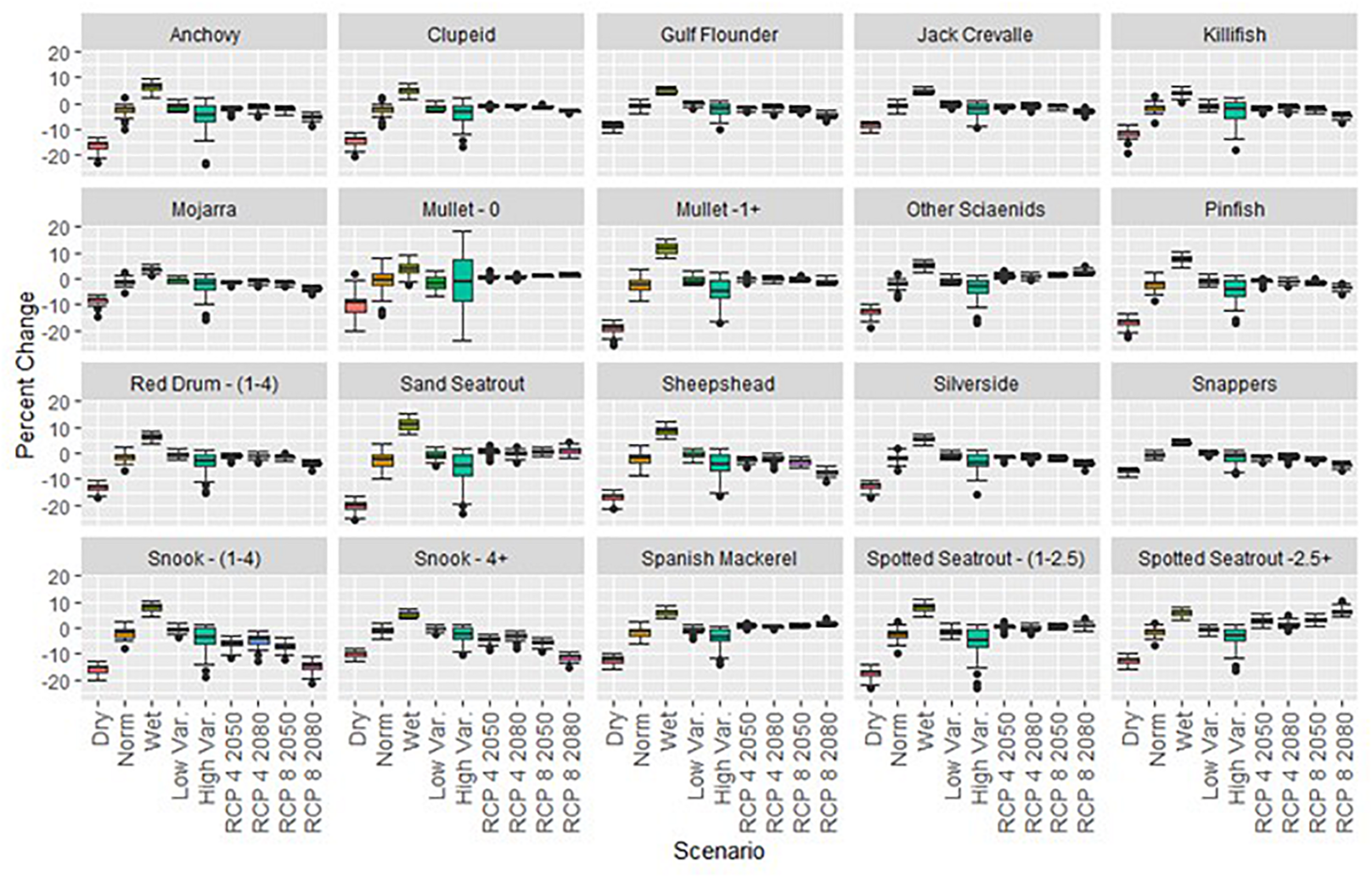 The ecology of estuaries is shaped significantly by the extent of freshwater discharge which regulates abiotic processes and influences overall biological productivity. The Suwannee River Estuary of Florida’s Big Bend Coastline has historically been a productive and diverse estuarine ecosystem supported by significant freshwater inputs from the Suwannee River. In recent years, significant changes in land use and climatic conditions have resulted in lower discharges from the Suwannee. Our objectives were to explore the impact of freshwater inputs from the Suwannee River on the estuarine forage fish and sportfish communities downstream. We built a trophic-dynamic food web model in Ecopath with Ecosim to simulate different levels of discharge and evaluate how changes in discharge (drought and floods) would influence the trophic structure of the food web. Using the fitted model, we applied a series of different short-term and long-term flow projections under different climatic scenarios to evaluate impacts on fish functional groups and sportfish biomass. Simulations suggested that ecological production was more influenced by drought conditions than flood conditions. In our short-term scenarios, the drought simulations produced biomass changes that were approximately twice as substantial as the flood scenarios. When making comparisons to other published EwE models, we generally observed smaller changes in biomass production. Although this model focused on the influence of bottom-up effects, we observed strong top-down control of snook (Centropomus undecimalis) on the system. Several functional groups were particularly sensitive to changes in snook abundance which included spotted seatrout (Cynoscion nebulosus), sand seatrout (C. arenarius), and other members of the family Sciaenidae. Because snook have recently colonized the estuary, likely as a result of warmer winter temperatures, this finding has implications for climate change and natural resource management.