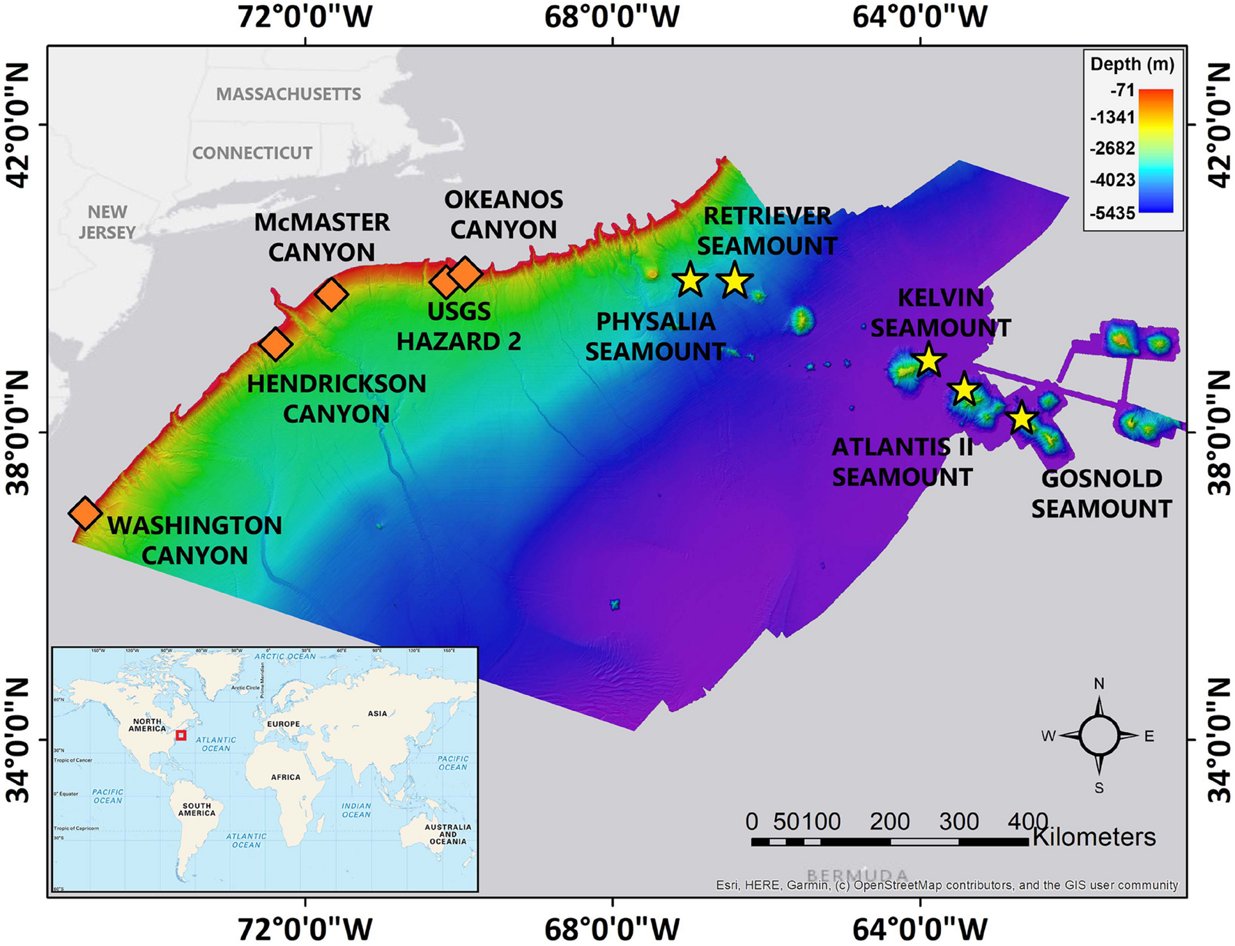 Water temperatures are expected to increase and dissolved oxygen concentrations are expected to decline around the seamounts and submarine canyons in the Northwestern Atlantic (Bindoff et al., 2019). Submarine canyons and seamounts are ecologically and economically important features that support a high biodiversity and biomass of cold water corals, sponges and bryozoan reefs (Rowden et al., 2010; Vetter et al., 2010; Lapointe et al., 2020). They are also habitat for fishes, some of which are commercially important (Miller et al., 2015; Quattrini et al., 2015). Though canyons and seamounts serve as hotspots for benthic faunal diversity and abundance, their contrasting geomorphological and environmental variables can differentially influence associated species assemblages (Schlacher et al., 2007; Cordes et al., 2010; Quattrini et al., 2015, 2017; Gallo et al., 2020). Valleys in the continental slope often constrain accelerated currents that transport nutrients and debris down slope (Vetter and Dayton, 1999; De Leo et al., 2010) to create complex circulation patterns that facilitate high secondary production (Shepard et al., 1979; Mortensen and Buhl-Mortensen, 2005). Due to their rugged topography, canyons are not typically trawled and can therefore provide refuge for commercially harvested species (Yoklavich et al., 2000). Seamounts are undersea mountains rising from the abyssal plains. Similar to canyons, their topography disrupts ocean circulation, causing localized changes in currents that at times remove soft sediment (Koslow et al., 2016). Seamounts are thought to serve as stepping stones for larval dispersal (Rowden et al., 2010) and their unique topography combined with associated up-or-down-welling enhances biodiversity (Roden and Taft, 1985; Genin et al., 1986; Levin and Sibuet, 2012).
