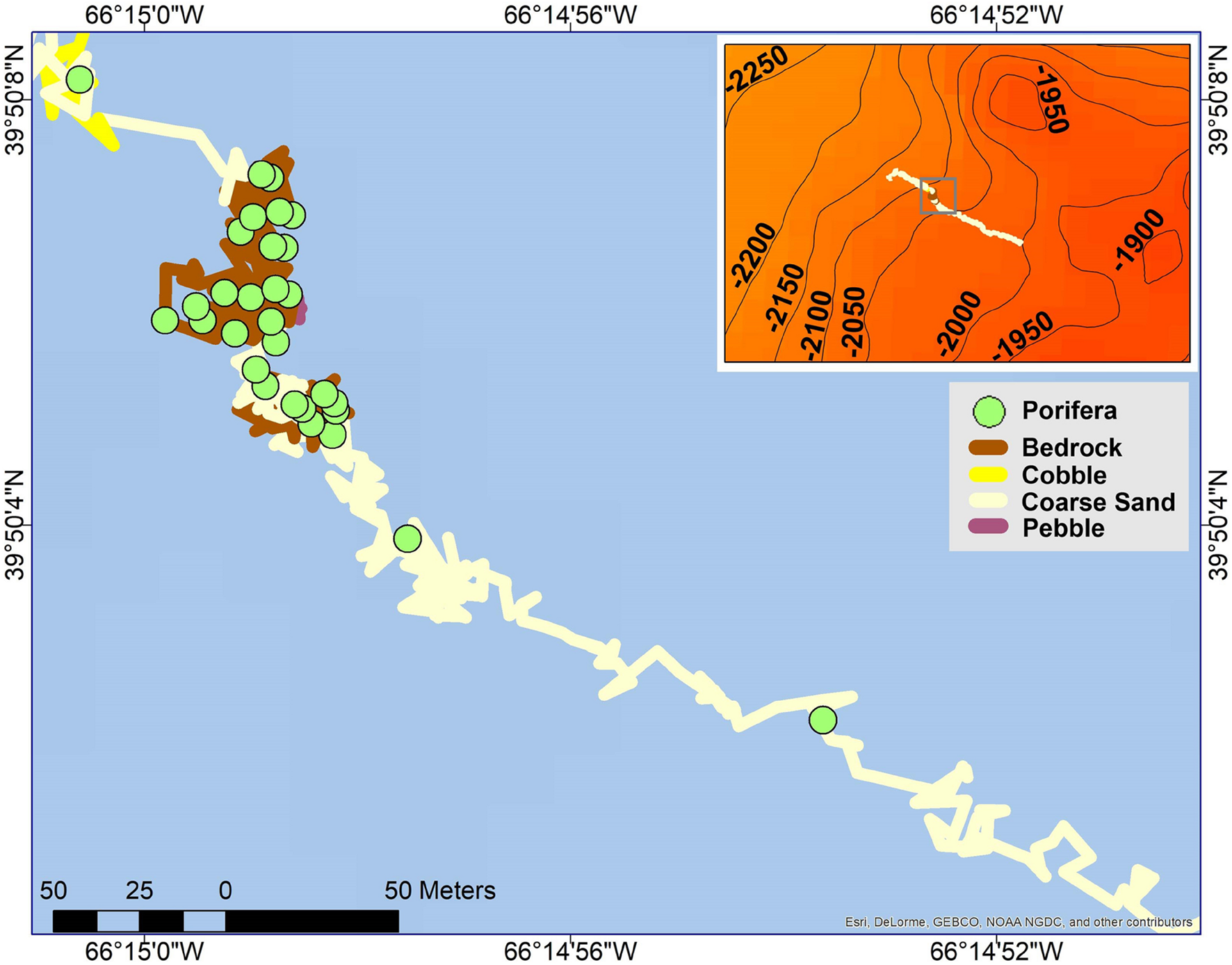 Organismal abundances were obtained by annotating organisms observed within the 0.1 m laser dots with an additional 0.2 m analyzed on either side of the laser points for a total width of 0.5 m. For portions of the video in which the lasers were turned off, organisms were placed in bins of abundances of 1, 2–4, 5–9, 10–14, and 15–19 with corresponding values of 1, 3, 7, 12, and 17 used for further analysis. Segments with organismal abundance higher than 20 were binned by groups of 10 (e.g., 21–30, 31–40 etc.) and were assigned the average (see Dijkstra et al., 2021 for more information). Segments in which the organisms could not be identified owing to the altitude of the ROV or when the camera was zoomed in were not annotated. Temperature, salinity, dissolved oxygen, depth, and slope were averaged for each 50 m segment. All organism annotations were plotted along the ROV track using ArcGIS (for an example see Figure 2). Primary substrates were classified for each segment using the Coastal and Marine Ecological Classification Standard (CMECS, FGDC, 2012). Ten primary substrate classes were identified: bedrock, silty bedrock, boulder, pebble, cobble, coarse sand, muddy sand, silty sand, clayey sand, and coral rubble.