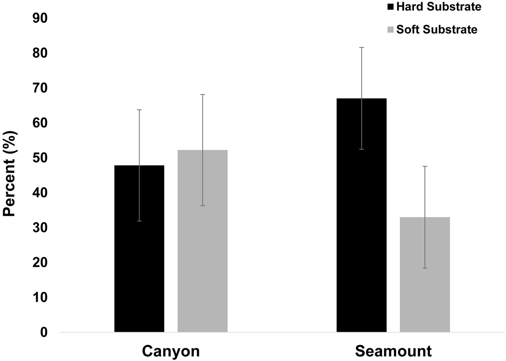 Percent of hard and soft substrates observed in canyons and seamounts (n = 1,796). Hard substrate was observed more often on seamounts.