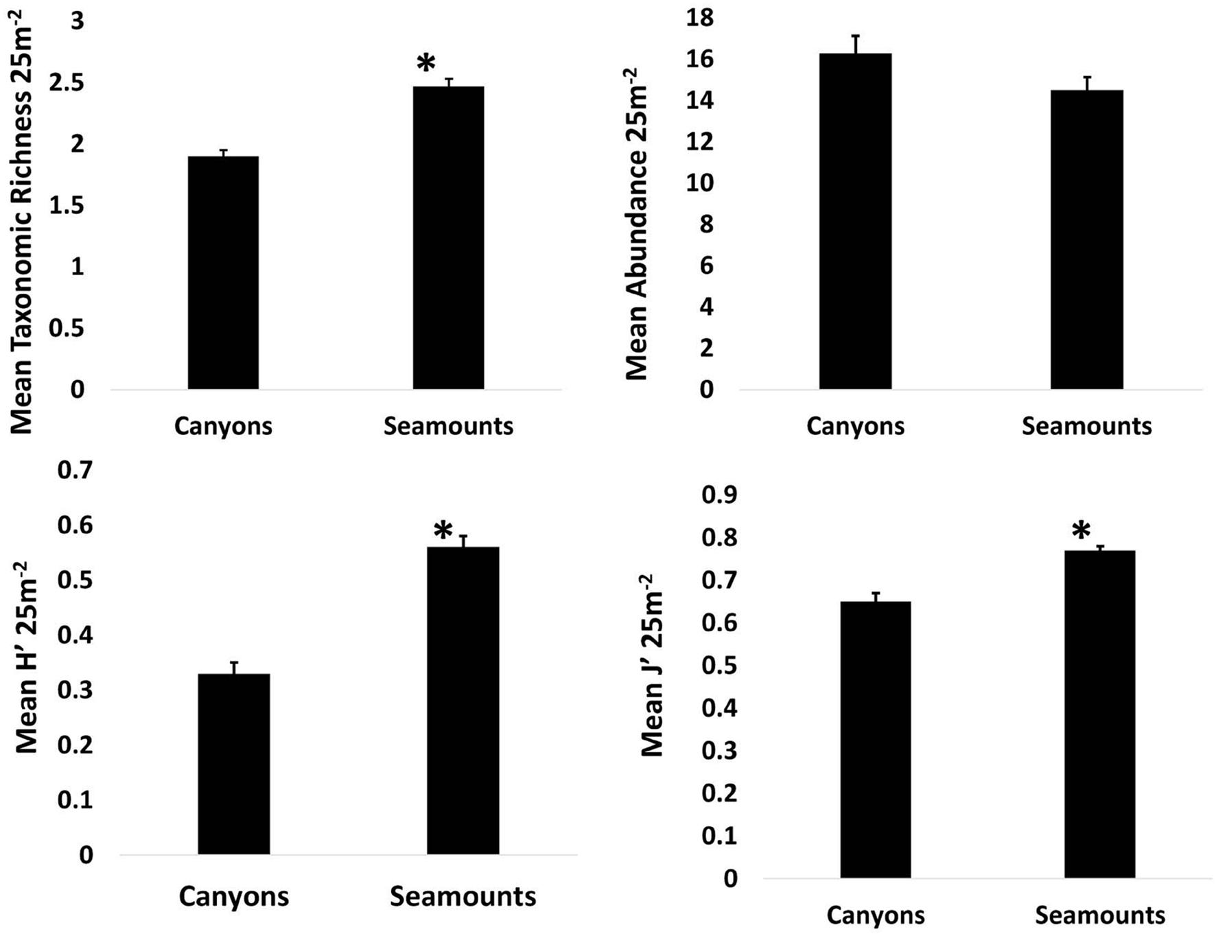 Mean taxonomic richness, abundance, diversity (H′), and evenness (J′) for segments within canyons (n = 533) and segments on seamounts (n = 572). Error bars are standard error. Asterisks denote significant differences.