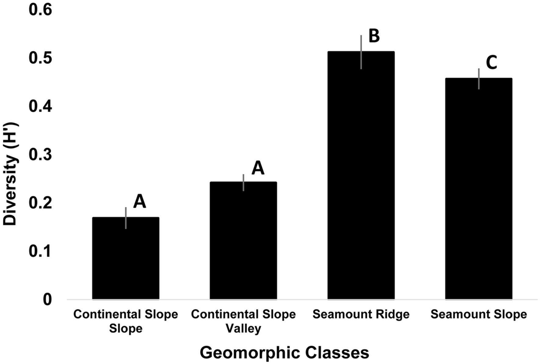 Diversity as a function of geomorphology (n = 1,105). Washington Canyon was excluded as bathymetry was not collected at this site. Highest diversity was observed on seamounts, specifically seamount ridges. Diversity was significantly different among all geoforms, except for Continental Slope Slope and Continental Slope Valley in which no differences were observed. Error bars represent standard error and different letters denote significant differences.