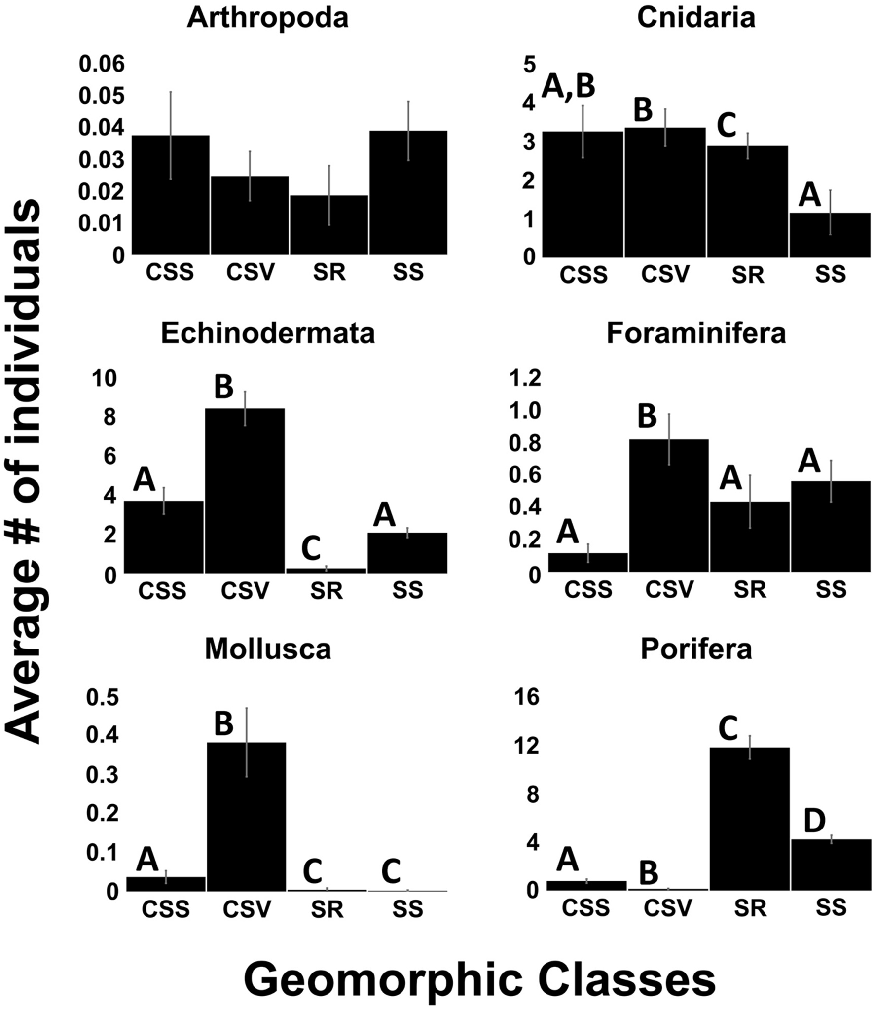 Abundances of phyla as a function of geoformorphic classes Continental Slope Slope, Continental Slope Valley, Seamount Ridge, and Seamount Slope (n = 1,105). Error bars are standard error. Different letters within phyla denote significant differences in abundances.