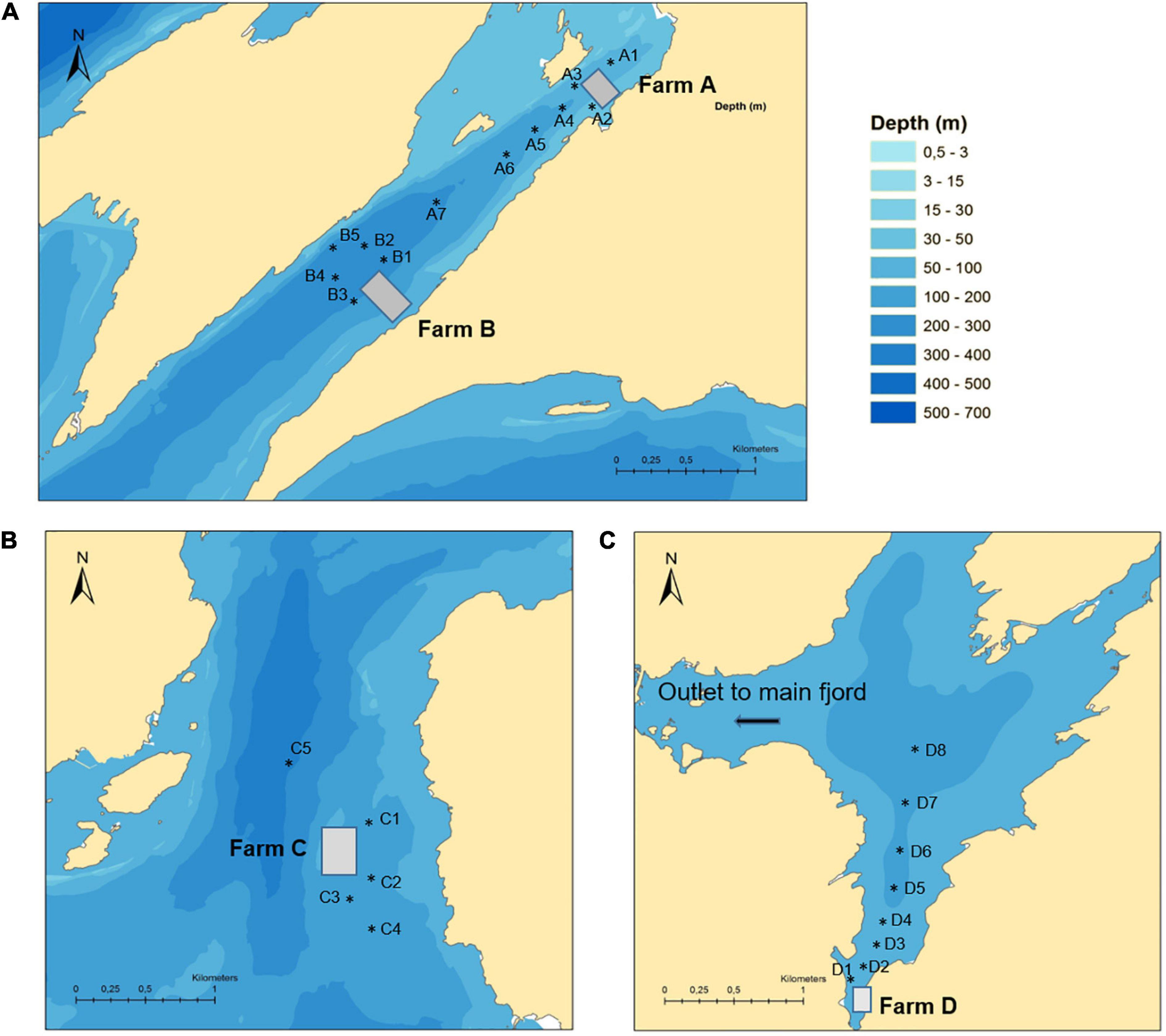 Locations of the four farms in a Norwegian fjord situated along the west coast. Farm A and Farm B are shown in panel (A), Farm C is shown in panel (B) and Farm D is shown in panel (C).