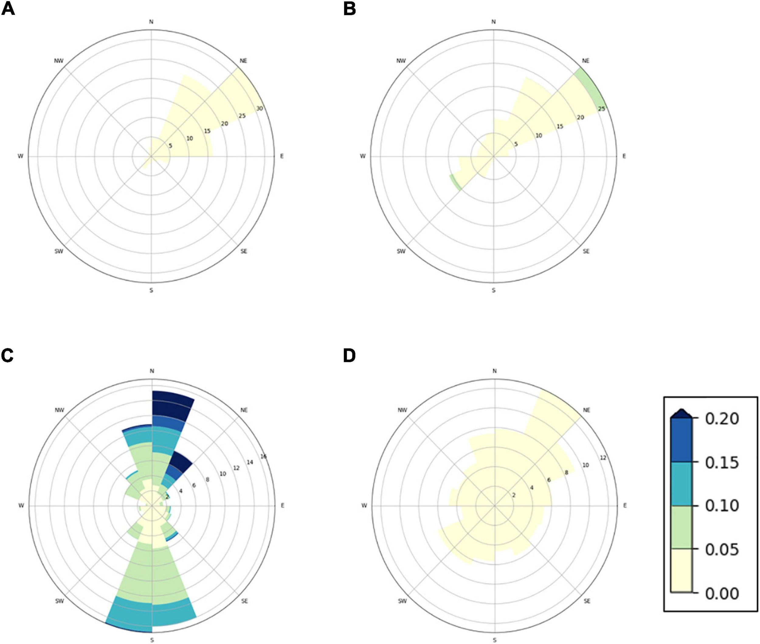 Current rose distribution plots showing velocity, frequency, and direction of ocean currents simulated at four Norwegian fish farms. Simulated ocean currents are shown for (A) Farm A, (B) Farm B, (C) Farm C, and (D) Farm D at a depth of 30 m. The coloured bands show the strength of the current (m/s).