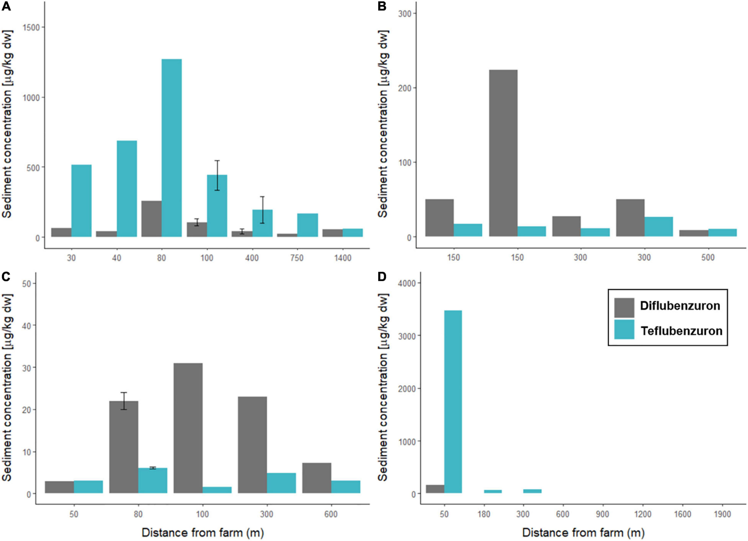 At Farm C, the highest diflubenzuron (31 μg/kg dw) and teflubenzuron (6.1 μg/kg dw) concentrations were detected in sediment sampled at stations C3 and C2, respectively, which were located 100 m south and 80 m east of the farm.