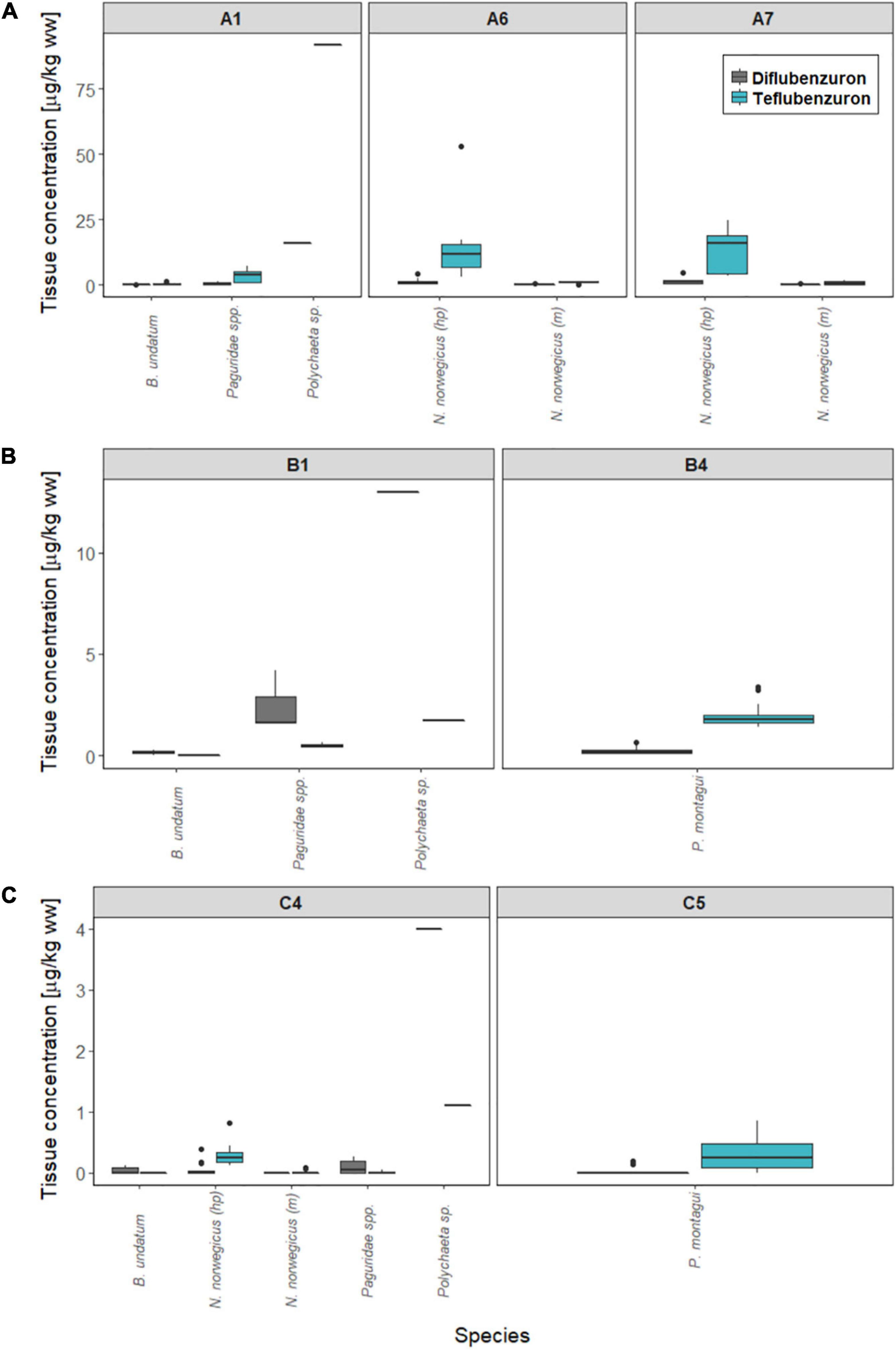 Diflubenzuron and teflubenzuron were detected in a total of 61 and 81% of wild benthic macro fauna samples in the present study, respectively, with both compounds occurring in all species collected (Table 3). Given the low bioavailability and quick elimination of diflubenzuron and teflubenzuron in salmonids (European Medicines Evaluation Agency, 1999a, b) and European lobster (Homarus gammarus) juveniles (Samuelsen et al., 2014), our results suggest that benthic biota are continuously exposed to these compounds around aquaculture sites in Norway resulting in the widespread detection of these compounds in the organism sampled here. It appears that there are interspecific variations in the concentrations measured, with polychaeta sp., exhibiting a greater tendency to accumulate both diflubenzuron and teflubenzuron compared to B. undatum, Paguridae spp., N. norvegicus, and P. montagui (Figure 4). While these variations may be related to a number of factors including their different dietary routes, metabolic abilities and physiological activities, it is important to note that a sufficient number of polychaetes for chemical analysis were only found in the sediments closest to the Farms A, B, and C and therefore this may be a key underlying factor behind the observed differences. Many polychaete species burrow in sediments and/or consume organic waste from fish farms and this may also be a reason for the higher contaminant levels measured in polychaetes compared to the other epibenthic biota sampled. Interesting, lower levels of diflubenzuron and teflubenzuron were measured in B. undatum and Paguridae spp., despite being sampled at some of the most contaminated locations (A1, B1, and C4) and suggest that oral absorption of these compounds may be particularly low in these species or they are metabolised/eliminated very quickly. In addition, diflubenzuron and teflubenzuron may be associated to biological matrixes such as organic waste and prey species (e.g., polychaetes) that B. undatum and Paguridae do not utilise.