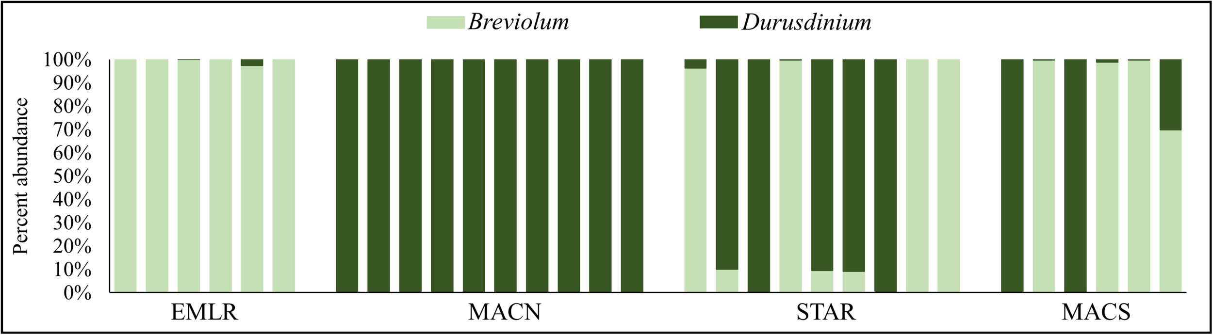 Supplementary Figure 3Species- level endosymbiont composition of 31 individuals of P. strigosa collect from (A) an offshore reef (Emerald Reef, EMLR) and urban coral sites (B) MacArthur North (MACN), (C) MacArthur South (MACS), and (D) Star Island (STAR) near Port of Miami, FL.