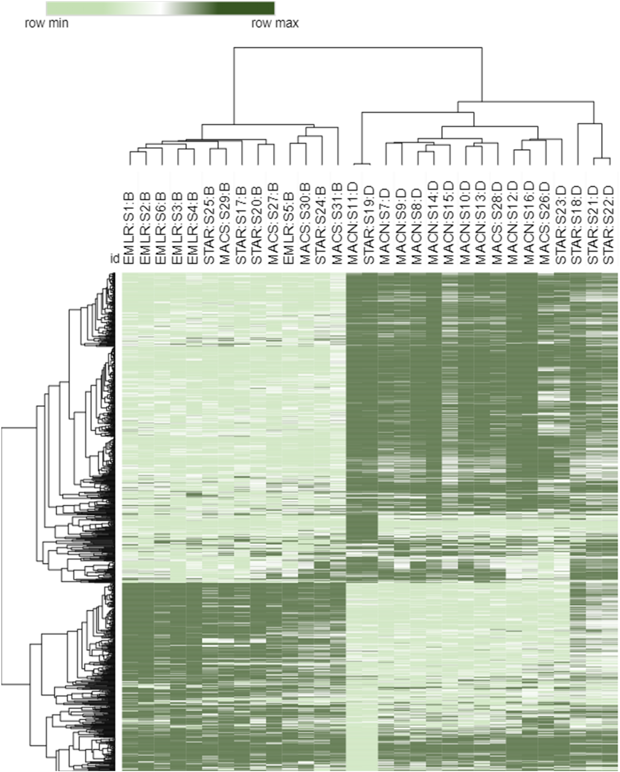 Heat map of top 1,000 transcripts contributing the highest weight to the PC1 axis of the PCA in Figure 3. Both samples and transcripts were clustered using the k-means complete hierarchical clustering method and a Euclidean distance dissimilarity matrix. The samples are labeled with a study site (MACN, MACS, STAR, EMLR), sample number (S1–S31) and dominant symbiont type (B-Breviolum and D-Durusdinium).