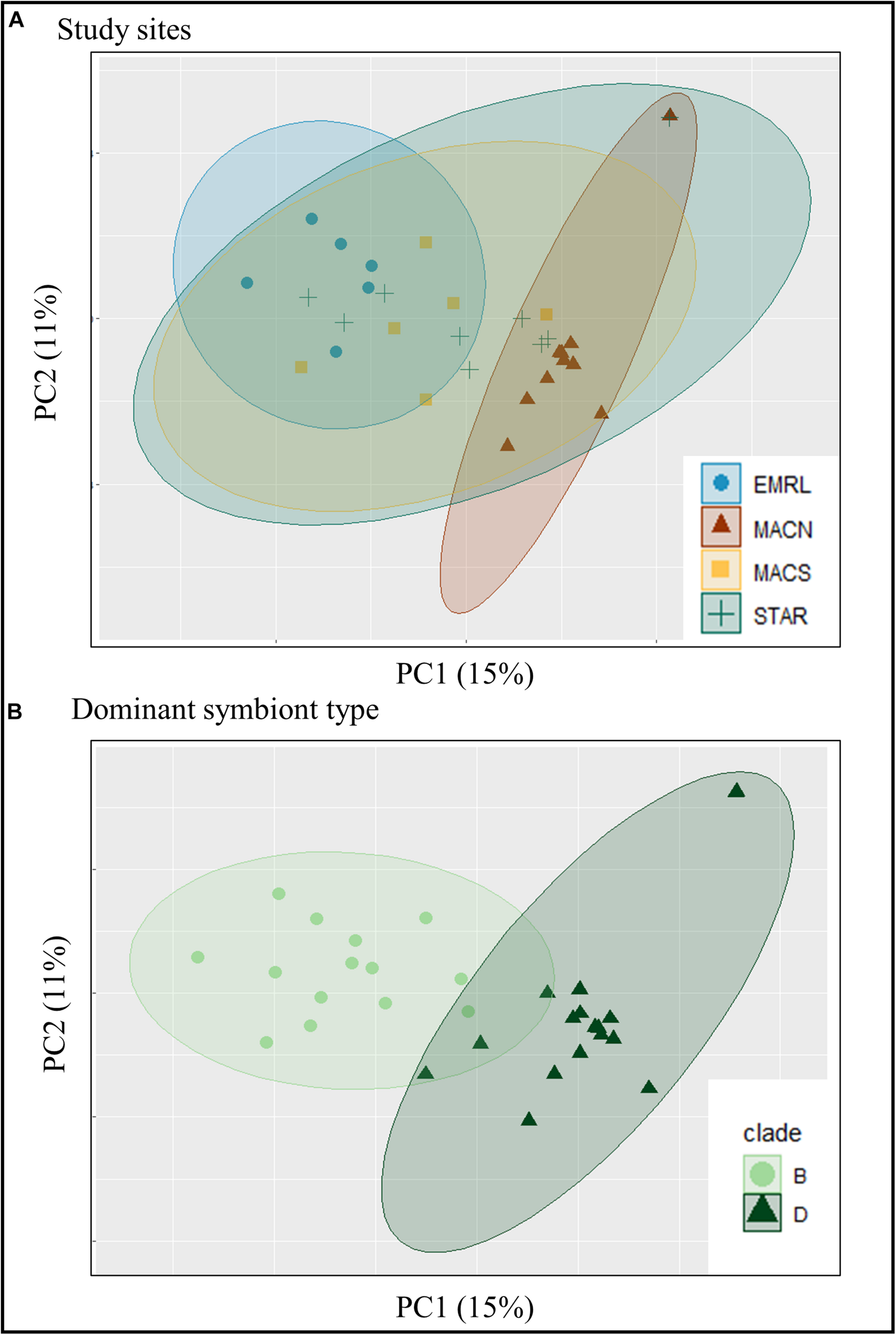 Sample similarity based on the P. strigosa transcriptome expression profiles were investigated using PCA, and samples were partitioned into three identifiable clusters within the PCA ordination (Figure 3A). The PC1 and PC2 together explained 26% of the total variability in gene expression. Samples from MACN and EMLR were most distinct from one another, with samples within each site demonstrating the strongest clustering. In contrast, samples from STAR and MACS showed greater variability and overlapped one another, as well as spanned the PC1 (15%) data space (Figure 3A). When dominant symbiont types were superimposed on the PCA, clear differentiation was observed between transcriptomes of Durusdinium-dominated and Breviolum-dominated corals (Figure 3B). In addition, endosymbiont type was the main factor contributing to the PCA structure based on hierarchical clustering analysis of the 1,000 transcripts contributing the most weight to the PC1 (Figure 2).