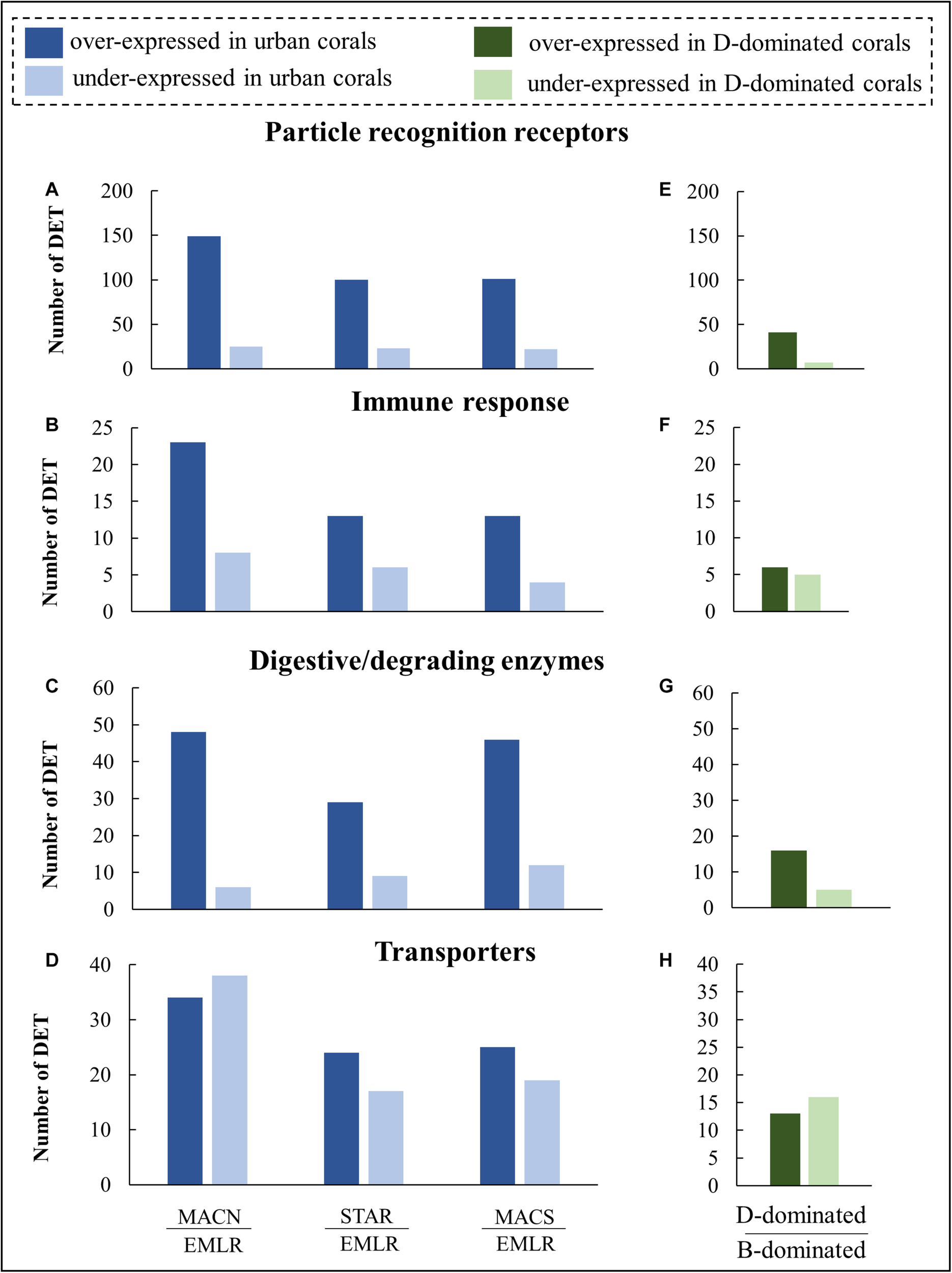 Distribution of DETs in P. strigosa colonies grouped into four molecular-function categories. Differential expression analyses were made between colonies from each urban site (MACN, MACS, STAR) and colonies from an offshore reef (EMLR) which was used as a control (A–D), and additional analysis was made between colonies (n = 17) dominated by Durusdinium symbionts (D-dominated) in comparison to colonies (n = 14) dominated by Breviolum (B-dominated) symbionts (E–H).