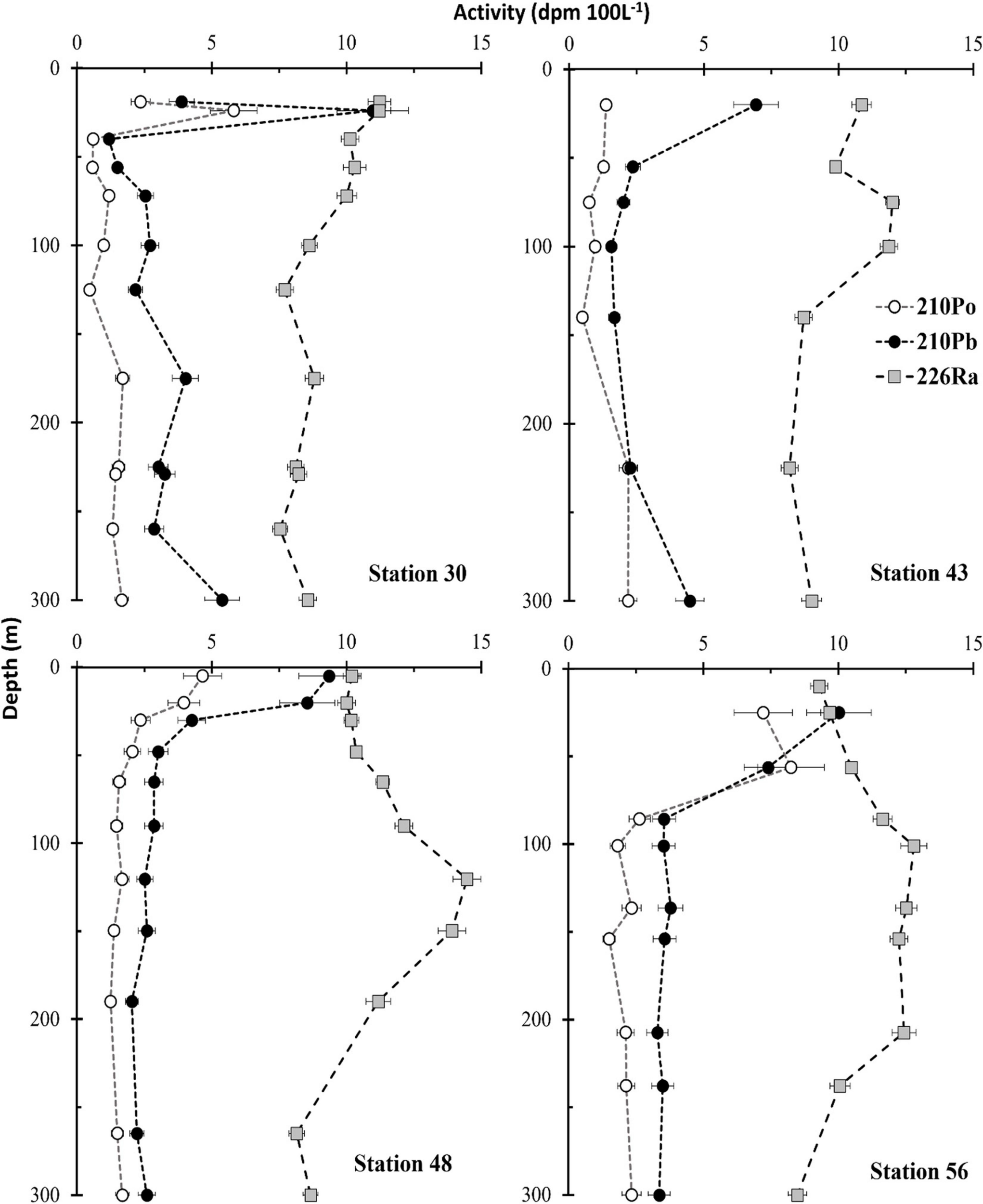Figure 4. The water column profiles of total 210Po (open circle), 210Pb (filled circle), and 226Ra (filled square) at each station.