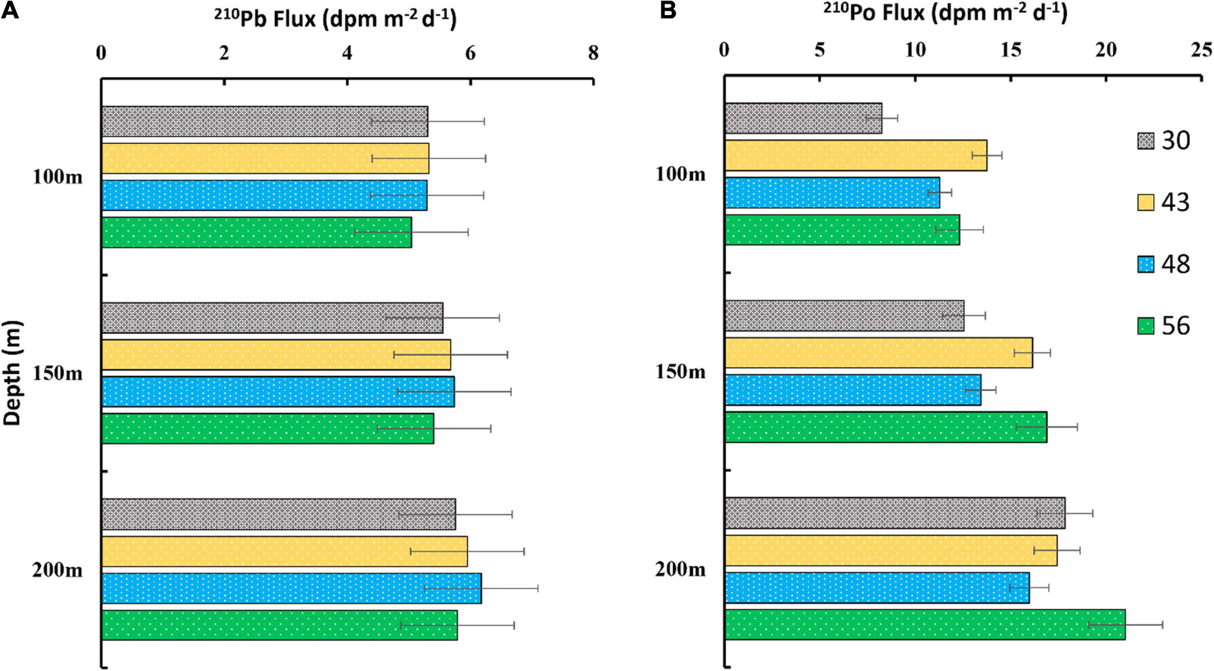 Water column 210Pb and 210Po fluxes were calculated according to eqn 3 and 4, respectively, at the base of the euphotic zone (100 m) as well as at 50 m and 100 m below the base of the euphotic zone (150 and 200 m water depth). The 210Pb fluxes ranged between 5.04 ± 0.92 and 6.20 ± 0.92 dpm m–2, d–1 with highest 210Pb flux at station 48 and lowest at station 56 (Figure 6A). The 210Pb fluxes for all the stations were similar within uncertainties. The 210Po flux ranged between 8.26 ± 0.89 and 21.0 ± 1.9 dpm m–2 d–1 with highest 210Po flux observed at station 56 and lowest at station 30 (Figure 6B).
