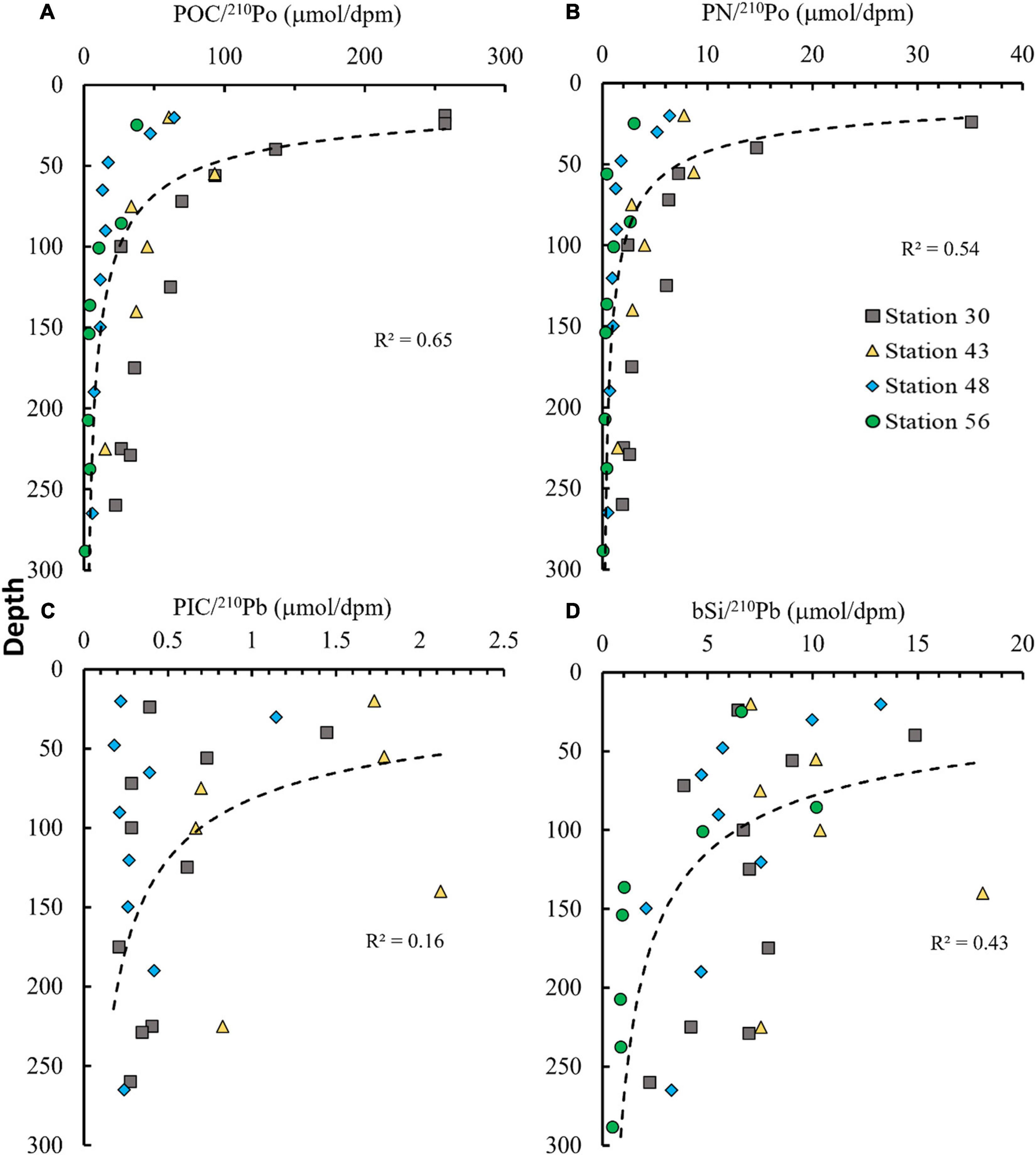 Figure 7. The ratios of (A) POC/210Po, (B) PN/210Po, (C) PIC/210Pb and (D) bSi/210Pb in the large particulate samples for upper 300 m water column depth. The dashed black line represents the power function fitted using the samples collected in upper 300 m depth.