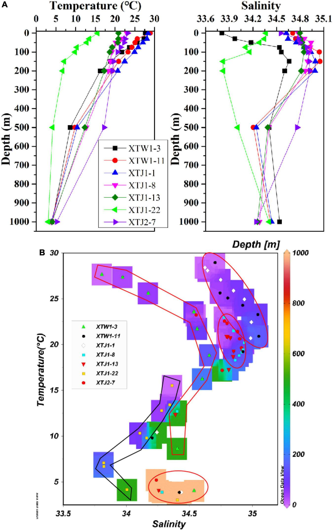 Profiles of temperature and salinity (A) and temperature-salinity-depth diagram (B) for the samples collected in the study area.