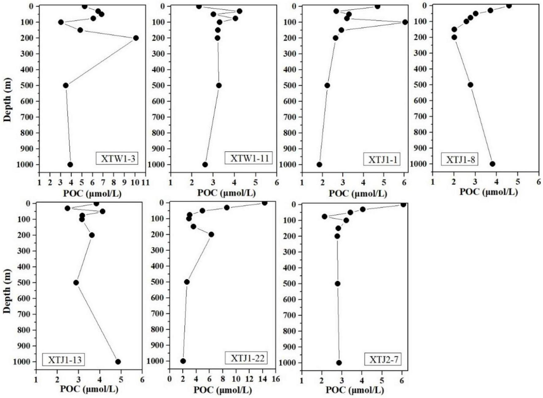 All POC concentration data can be found in Supplementary Table 1. In total, the POC concentrations ranged from 1.85 to 14.35 μmol C/L, with an average of 4.15 ± 2.15 μmol C/L in the w-NPO (Figure 3). Station XTJ1-22 at the Kuroshio Current-Oyashio Current boundary had the highest POC concentration (mean: 6.23 ± 4.12 μmol C/L) in the upper 150 m, followed by station XTW1-3 (mean: 5.44 ± 1.28 μmol C/L) in the Luzon Strait, while the other five stations had similar POC concentrations with a mean value of 3.12–3.81 μmol C/L (Table 1). Almost all POC profiles showed a decrease with increasing water column depth from 0 to 500 m, and remained relatively constant from 500 to 1,000 m except at two stations (XTJ1-8 and XTJ1-13) (Figure 3).