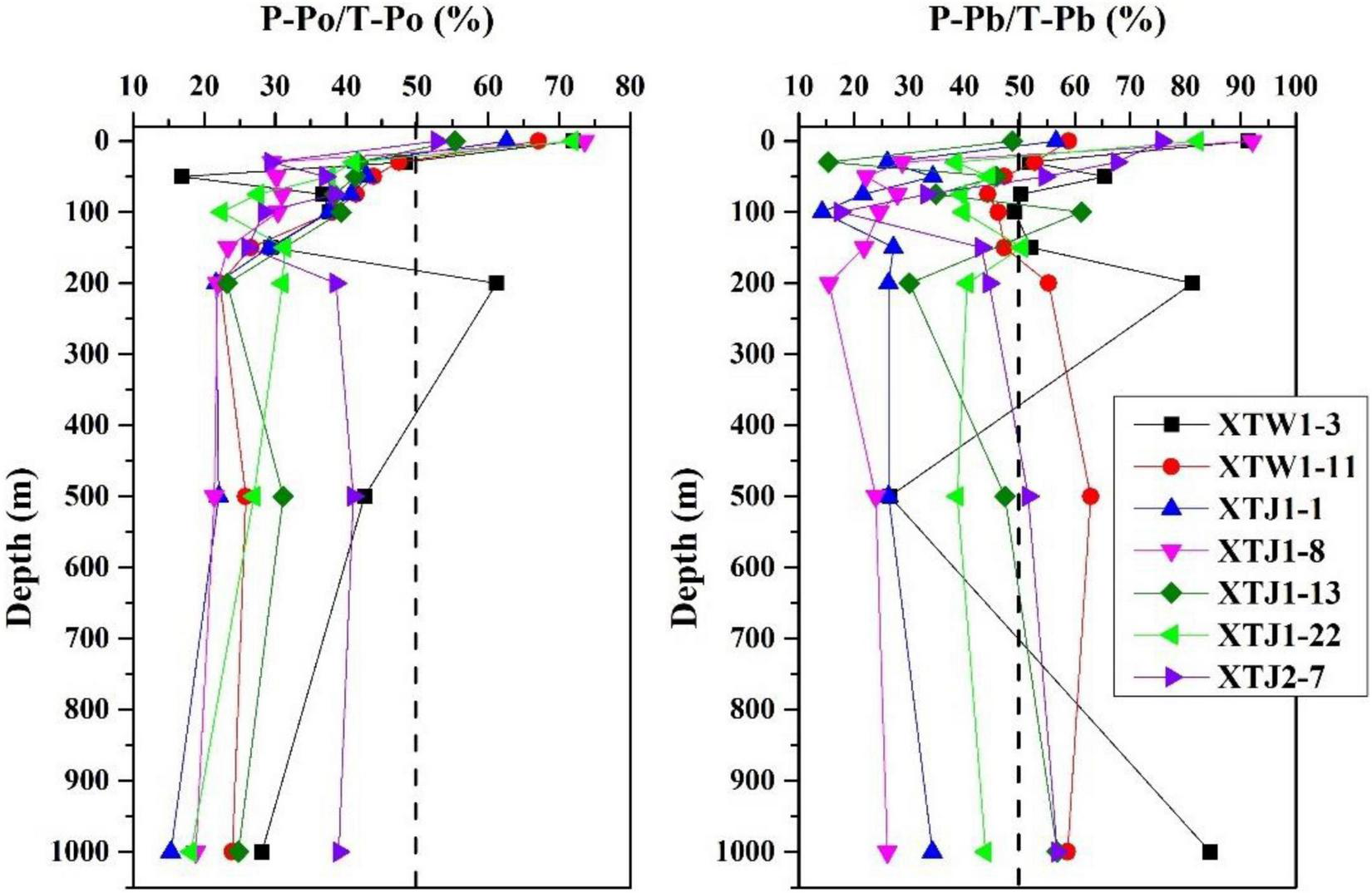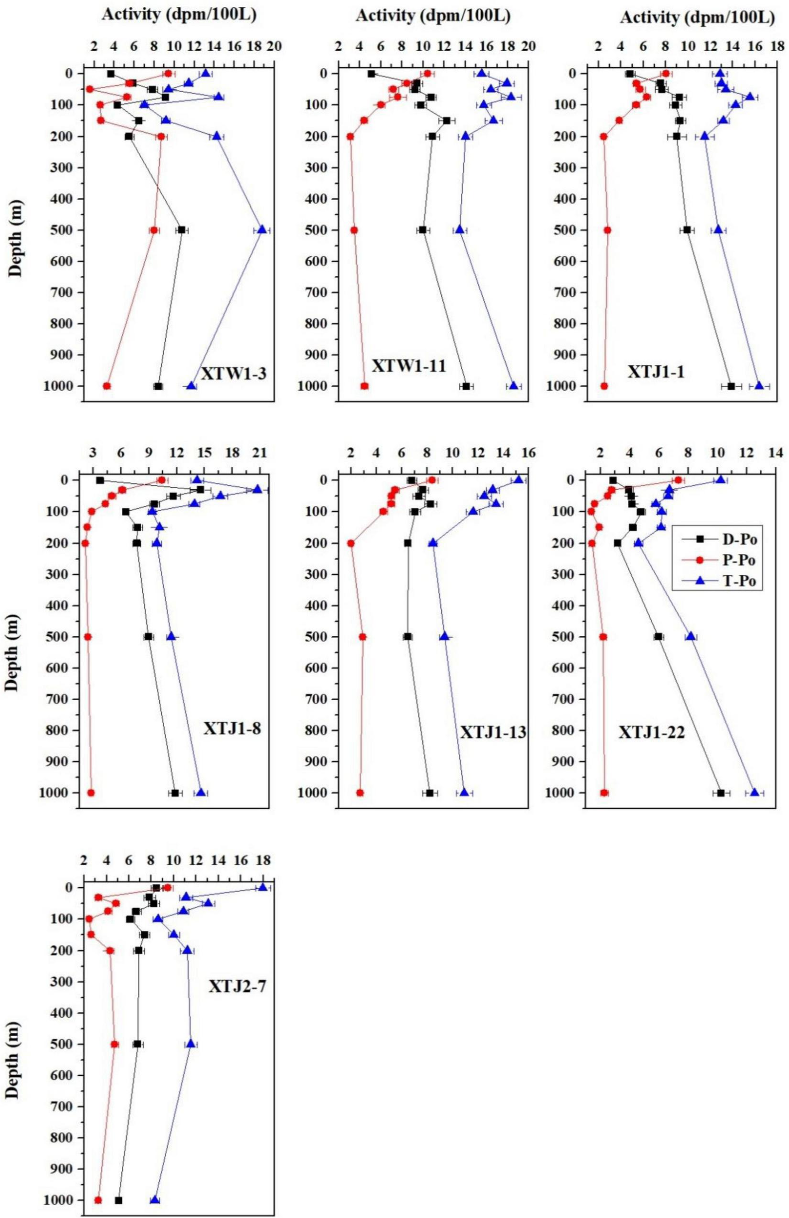 At greater depths (150–1,000 m), the JPo values were negative at all stations except stations XTJ1-13 and XTJ2-7 (Table 1), further demonstrating the occurrence of 210Po remineralization in the deeper ocean. However, due to the release of 210Po, τPo–D could not be calculated at almost all stations in the deeper layer (150–1,000 m) except at station XTJ1-13. The PPo values were negative at stations XTJ1-1 and XTJ1-8, implying that 210Po could not be removed from the 150–1,000 m layer to the much deeper (>1,000 m) ocean at these two sampling sites. In addition, the τPo–P in the 150–1,000 m layer ranged from 85 to 331 d at the remaining four stations (XTW1-3, XTJ1-13, XTJ 1-22, and XTJ2-7).