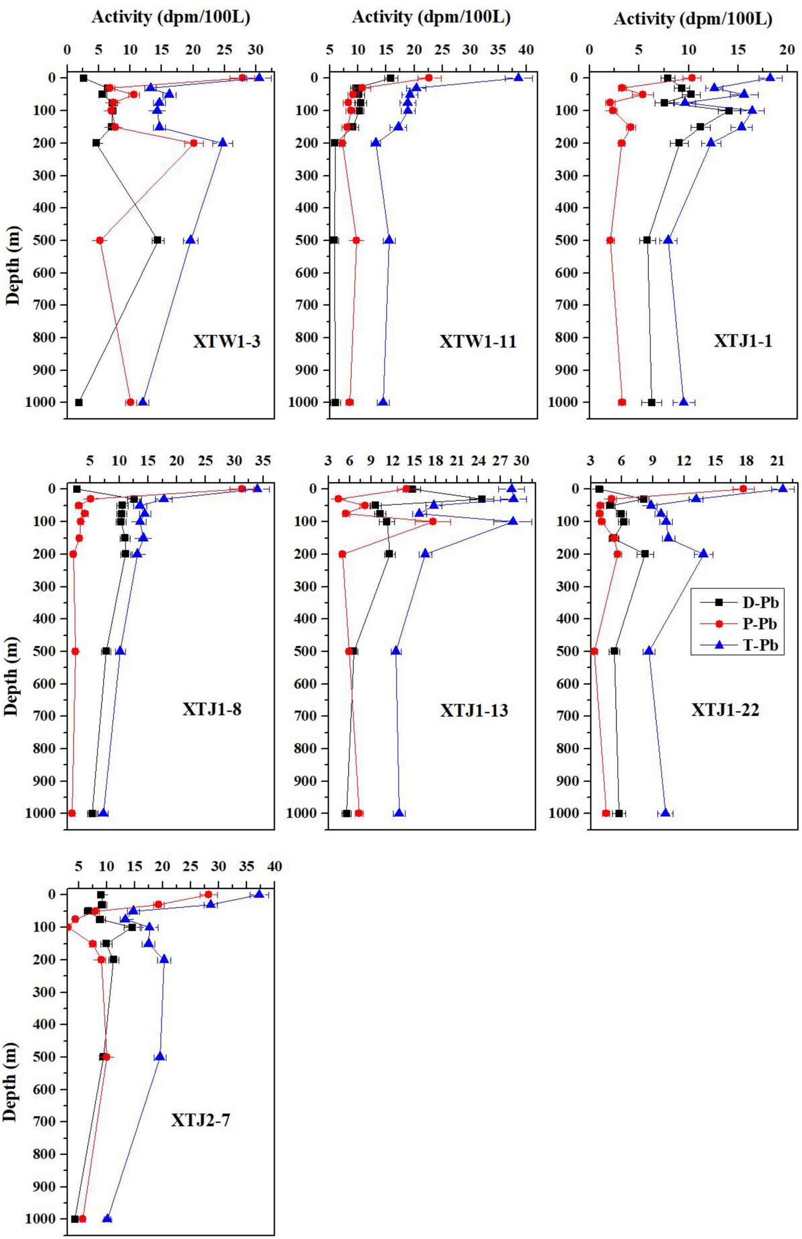 Furthermore, the P-Po/P-Pb ratios were nearly 1 or higher than 1 within 30–75 m at all stations (Figure 7), supporting the previously findings that 210Po was preferentially scavenged over 210Pb (Bacon et al., 1976; Murray et al., 2005; Tang and Stewart, 2019). In addition, on all profiles, both P-Po and P-Pb decreased with depth in the upper 100 m, which is consistent with the increases in D-Po and D-Pb (Figures 4, 5). The highest P-Po activity concentrations were presented at the surface for all stations (Figure 4), which could be related to particle concentration, since particle concentration is usually higher than in the twilight zone or deeper layers. D-Po increased from the surface to 1,000 m (Figure 4), especially at stations XTW1-11 and XTJ1-8, which showed subsurface D-Po maxima at 150 and 50 m, respectively. This phenomenon implies that sinking particulate matter is re-mineralized at depth in the w-NPO, which is supported by an excess of D-Po relative to 210Pb, with the D-Po/D-Pb activity ratios often > 1 below 200 m (Figure 7). Specifically, at station XTW1-11, the feature of D-Po/D-Pb > 1 appeared between 150 and 1,000 m, while at station XTJ1-1, D-Po/D-Pb > 1 only appeared between 500 and 1,000 m. Except for station XTJ2-7, the feature of D-Po/D-Pb > 1 appeared at 1,000 m for all stations (Figure 7). Based on the above discussion, it can be concluded that enhanced particle scavenging of both 210Po and 210Pb occurred in the upper ocean and that 210Po adsorbed onto particles from the upper ocean was released in the deeper ocean due to the remineralization of particulate organic matter below the mixed layer.