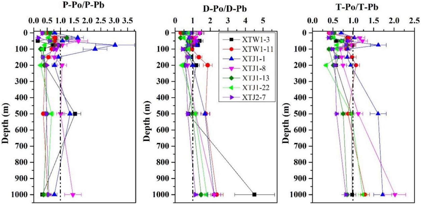 Vertical profiles of the 210Po/210Pb activity ratios in the particulate, dissolved and total fractions are plotted in Figure 7. Particulate matter was enriched in 210Po (particulate 210Po/210Pb activity ratios > 1) at the subsurface (50–100 m) at all stations, especially in the particulate sample from a depth of 75 m at station XTJ1-1, where the P-Po/P-Pb ratio reached 3.04 ± 0.73 (Figure 7). These data indicates that there was an excess of P-Po relative to P-Pb. The dissolved 210Po/210Pb activity ratios (D-Po/D-Pb) increased with depth, with values < 1 at the surface and increasing toward 1 or even > 1 below the euphotic zone, which complemented the elevated P-Po/P-Pb ratio. All stations showed similar vertical distributions of T-Po/T-Pb with a significant deficiency of 210Po relative to 210Pb from the surface to 200 m. The deficit of 210Po relative to 210Pb declined with depth and then approached equilibrium or shifted to an excess (210Po/210Pb≈1 or > 1) at different depths for different stations, except for stations XTJ1-1 and XTJ1-8, which displayed an excess of T-Po relative to T-Pb (T-Po/T-Pb ratio > 1) at 50–75 m and at 500–1,000 m. Interestingly, 210Po excess (T-Po/T-Pb ratios > 1.2) was observed in seawater at 500 and 1,000 m of station XTJ1-1 and in seawater at 1,000 m of station XTJ1-8 (Figure 7). From Figure 7, we can find that this 210Po excess is caused by the high dissolved 210Po activity concentration in the deep layers (500–1,000 m), because D-Po/D-Pb ratios at deep layers (500–1,000 m) were much higher than unity (Figure 7). And this high dissolved 210Po activity concentration implied the occurrence of a strong 210Po dissolution in the deep ocean.