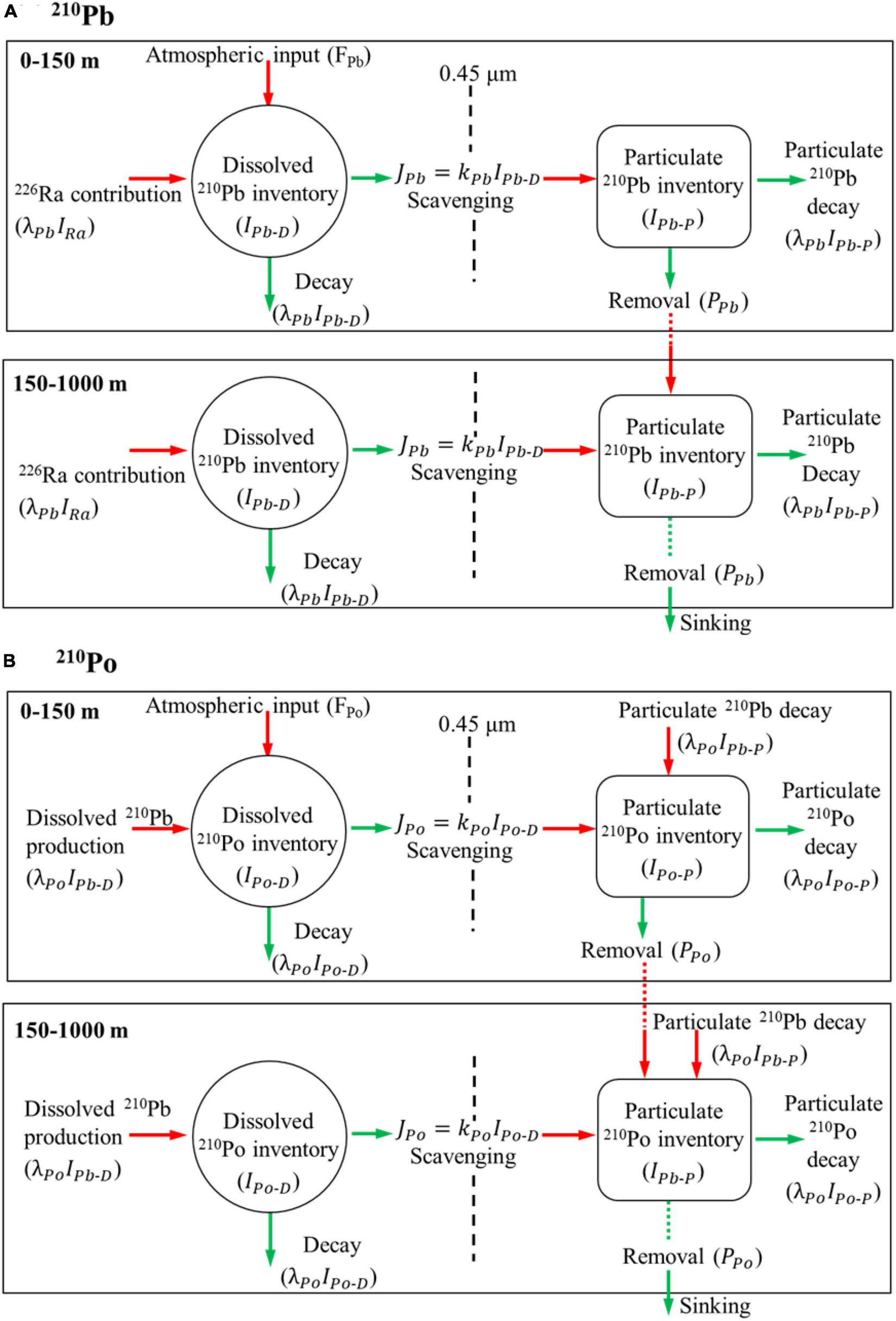 In the above equations, IPb and IPo are the inventories of 210Pb and 210Po, respectively, in the different boxes; PPb and PPo are the removal fluxes of P-Pb and P-Po, respectively, by particles sinking out of the box; JPb and JPo are the rates of scavenging of 210Pb and 210Po, respectively (if a radionuclide is transferred from solution to the particulate phase by particle scavenging, then J is positive, while J is negative for opposite); and τP and τD are the residence times of the radionuclides in the particulate and dissolved phases, respectively.