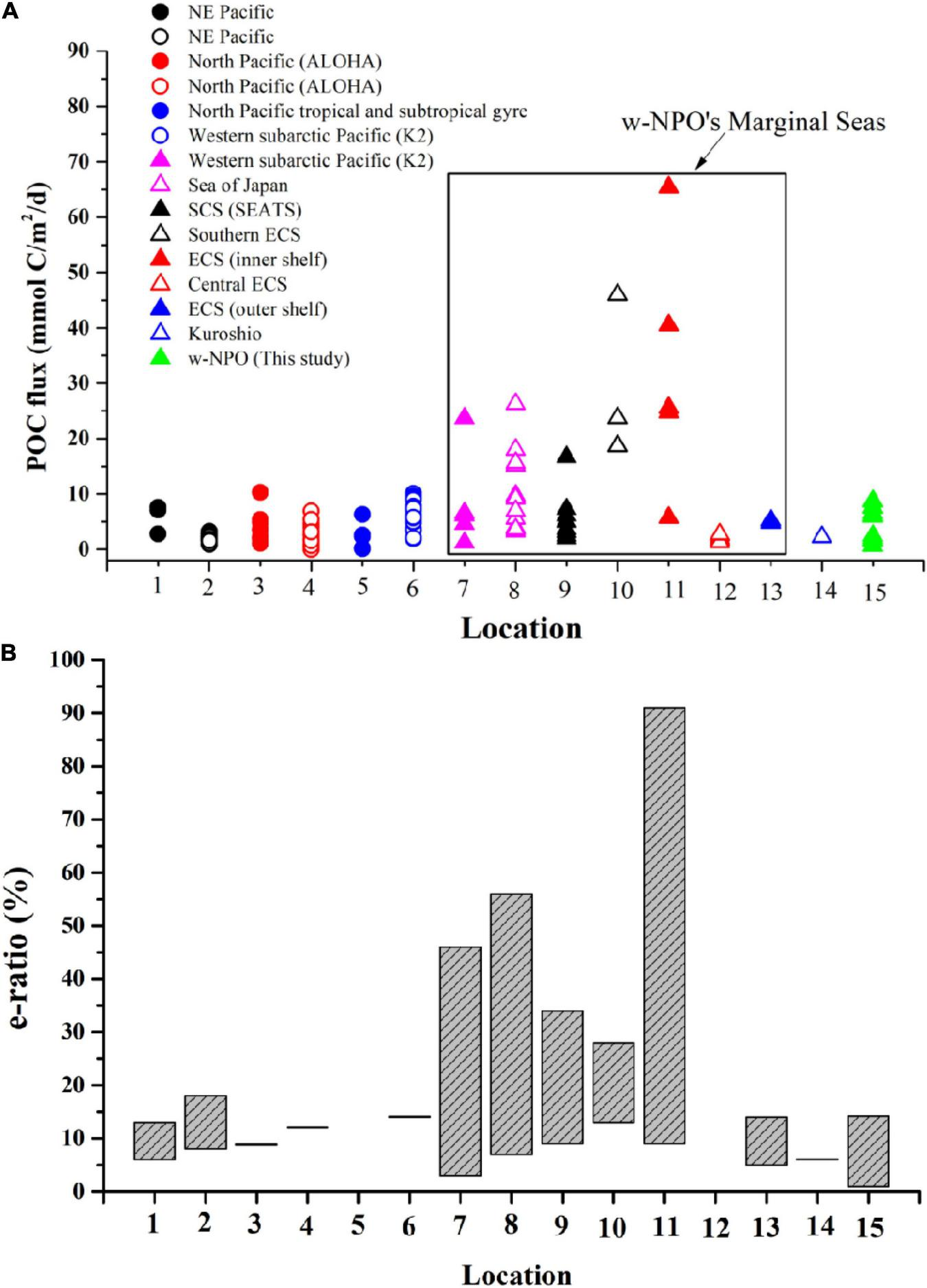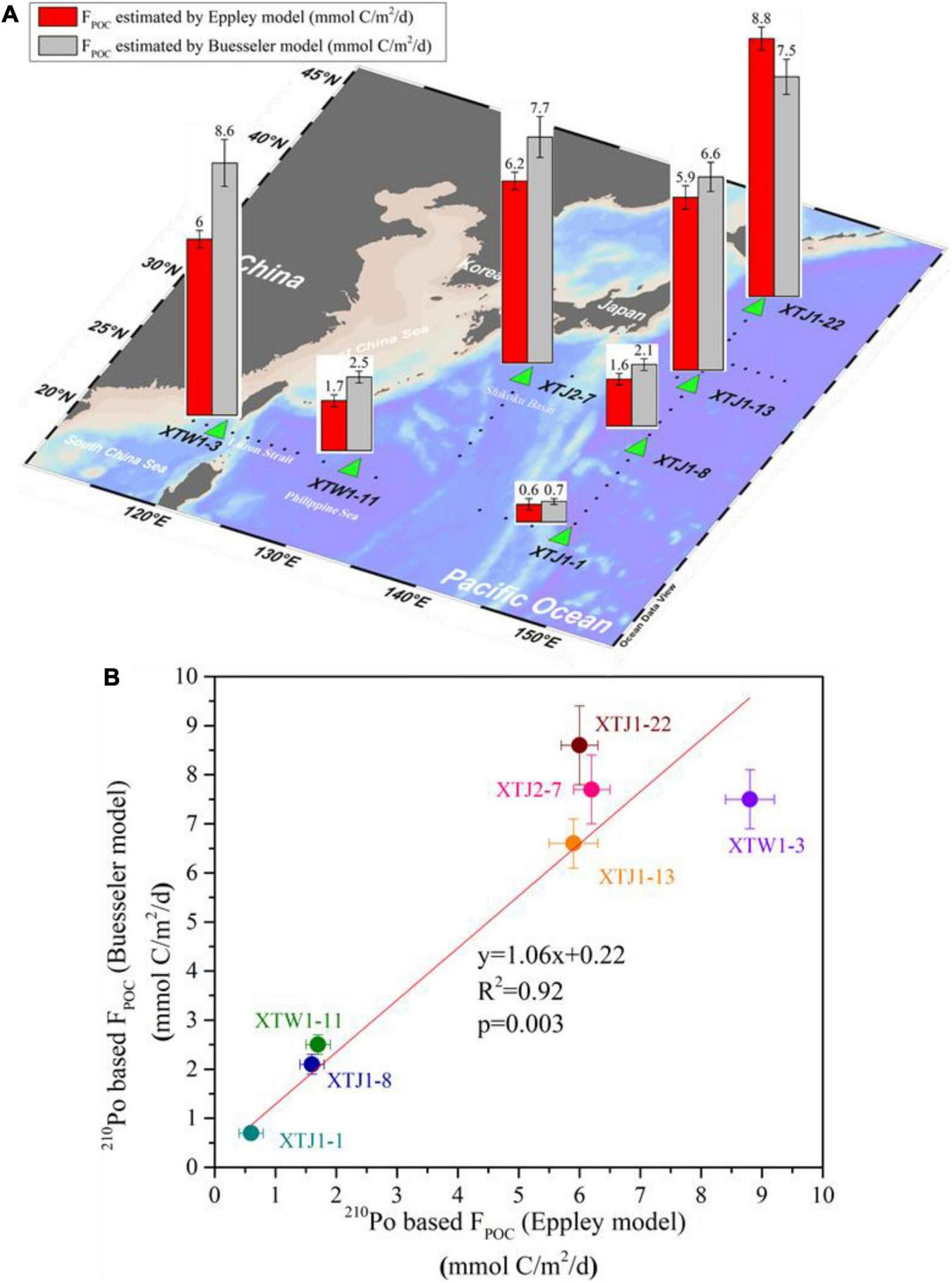 The POC fluxes estimated by the Eppley and Buesseler models in the upper layer of the w-NPO (0–150 m) are displayed in Table 3 and Figure 9. From Figure 9A, we can divide these seven stations into two groups. One group (Group I) includes the station XTW1-3 in the Luzon Strait, station XTJ2-7 in the northern Shikoku Basin, and station XTJ1-22 located in the Oyashio Current -Kuroshio Current boundary near the main island of Japan, which showed a higher estimated FPOC level of 6–9 mmol C/m2/d (see Table 3 and Figure 9A). The common characteristic of Group I was that all of them were located near the continental shelf of East Asia. However, station XTJ1-22 was also affected by the cold and nutrient-rich Oyashio Current, which appears to promote high primary production and subsequently high POC export flux. Therefore, the FPOC of station XTJ1-22 was the highest among all stations (Figure 9A).