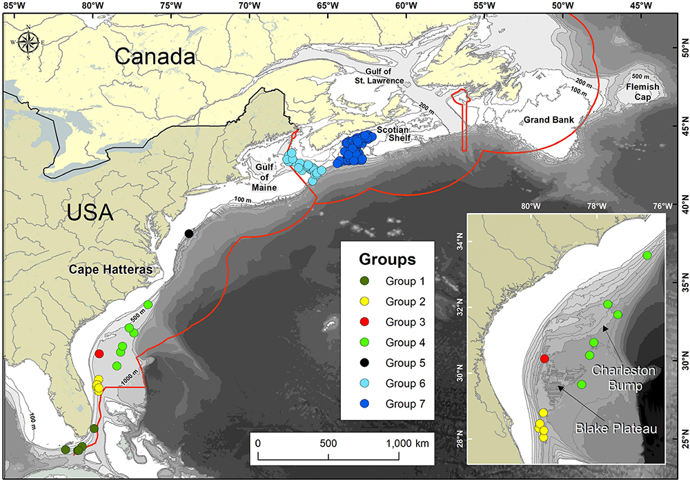 Place names and locations of confirmed occurrences of V. pourtalesii along the eastern coast of North America. Occurrences are colour-coded by their assigned Group (1–7). The inset shows the area of the Blake Plateau with the location of the Charleston Bump. Red line indicates the exclusive economic zones of the United States, Canada, and France (with respect to Saint Pierre and Miquelon). Additional place names, general position of major currents and water masses, topography, and undersea features in the study area are provided in Figure 2.