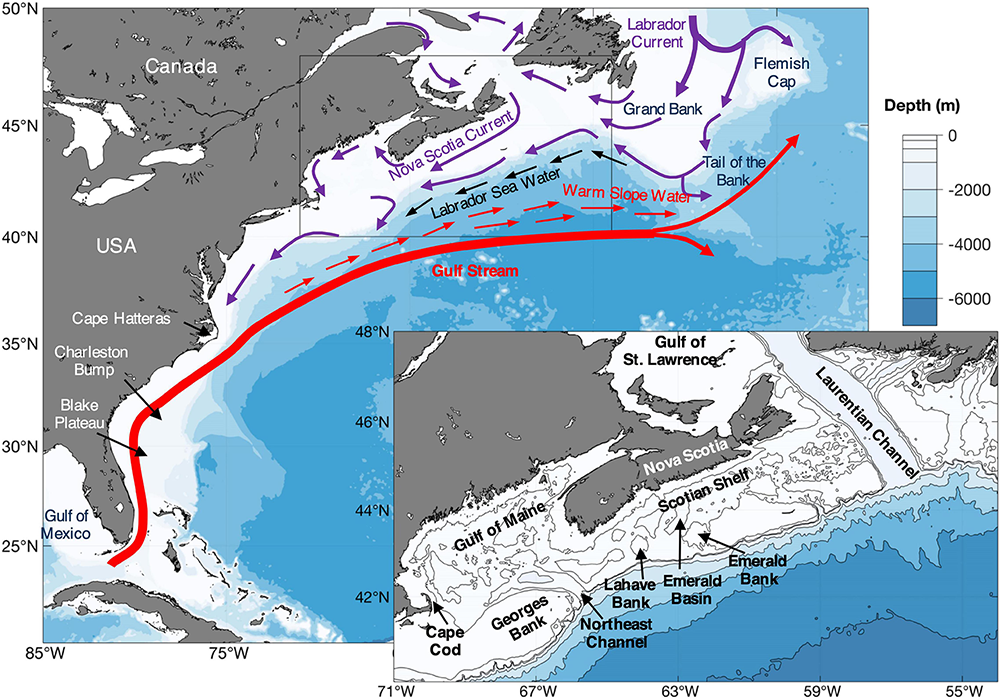 The physical oceanography of this region is very well studied, which allows for a detailed understanding of the conditions governing dispersal and distributions and enhanced interpretation of connectivity models. Two major current and water mass systems dominate the area occupied by V. pourtalesii: the fast moving Gulf Stream with its associated Warm Slope Water, and the continental-shelf waters from the Gulf of St. Lawrence to Cape Hatteras (Figure 2). The Gulf Stream exits from the Gulf of Mexico, transporting very warm, saline water and flows very swiftly along the shelf break, northwards to Cape Hatteras, North Carolina, where it breaks away from the continent, thereafter heading northeast and east to pass south of Grand Bank (Rossby et al., 1985). Before reaching Cape Hatteras, the Gulf Stream flows over the Blake Plateau, which projects from the continental slope at depths of approximately 700 m. At the northern end of the Blake Plateau, the Charleston Bump rises to about 375 m depth, deflecting the Gulf Stream, intensifying bottom currents and causing downstream eddy formation, mixing and upwelling (Popenoe and Manheim, 2001). The resulting Charleston Gyre becomes more prominent when the Gulf Stream is strong and transports Gulf Stream water inshore (McClain and Atkinson, 1985). Beazley et al. (2021) predicted some increase in suitable habitat for V. pourtalesii in this region in their climate projection models.