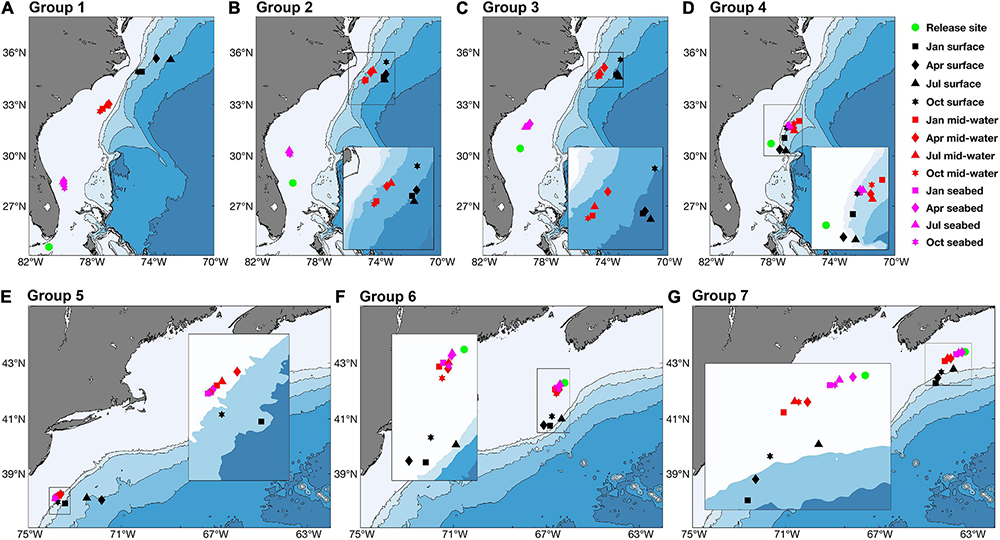 Mean ending positions of particles released at each of three depths in January, April, July, or October using long-term averaged currents in release sites from (A) Group 1, (B) Group 2, (C) Group 3, (D) Group 4, (E) Group 5, (F) Group 6, and (G) Group 7, modeled with kh = 0. (For results from modeling with kh = 250 m2 s–1, see Supplementary Figure 2.) Filled green circles denote mean release position of particles in the Group.
