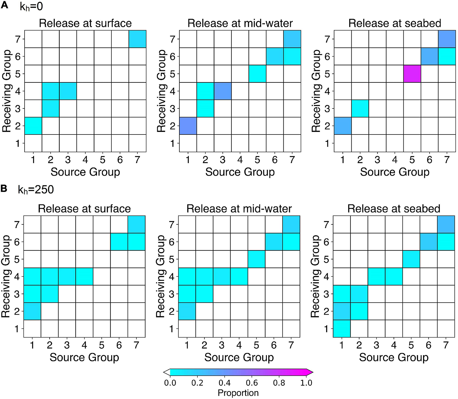 Results of particle tracking simulations using long-term averaged ocean currents from July after a 2-week drift duration for releases from the surface, mid-water depths and the seabed. Connectivity matrices showing the proportion of modeled particles released from each of the occupied grid cells in each of the seven Groups (Source) passing over or terminating in another occupied grid cell in another Group (Receiving Area). Diagonal cells indicate particle retention within the occupied cells within each Group. (A) when kh = 0 and (B) when kh = 250 m2 s–1.