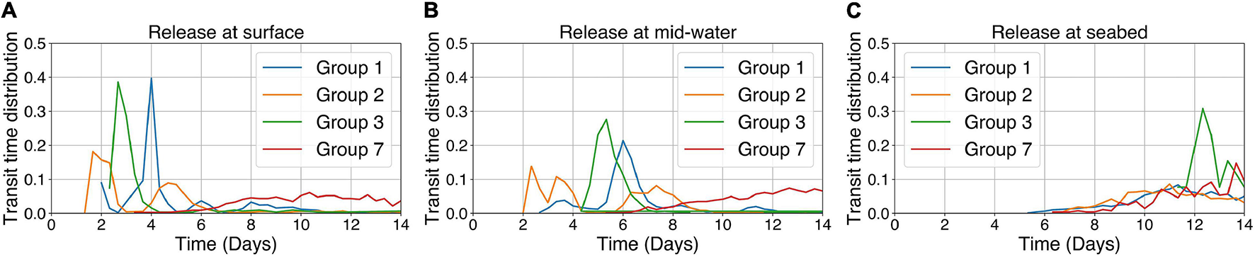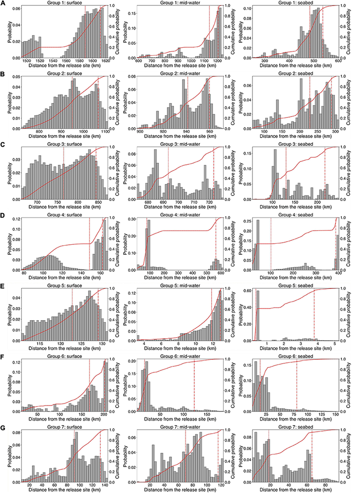The results of simulated larval dispersal experiments were evaluated using connectivity matrices, showing the percentage of particles from each source occurrence cell within a Group that either passed over or terminated in another receiving occurrence cell within a Group. Transit time distributions (TTD; McGuire and McDonnell, 2006) were calculated for particle movements from source occurrence cells within Groups to receiving occurrence cells within Groups. Individual-based dispersal was displayed as histograms of the flow distances traveled from each release point (Kool et al., 2013). Those distances were calculated from individual particle trajectories as the sum across the 2-week PLD of straight-line distances between the start and end positions of each 10-min time step. The median, 95th percentile and maxima of the distances were determined. Dispersal kernels were mapped using individual trajectories and/or averaged end positions.