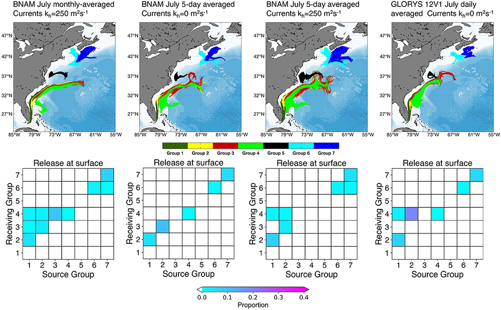 Horizontal diffusivity was alternatively modeled as zero or kh = 250 m2 s–1, the latter value being appropriate for mixing across the Gulf Stream (Bower et al., 1985; Anderson et al., 2000). Use of a non-zero value for kh is expected to have a greater effect on maximum, than on mean, transport distances and end positions (Edwards et al., 2007), partially simulates small-scale larval swimming behavior through the introduction of a random walk (Codling et al., 2004), and mimics some of the variance in the currents which was mostly removed in the averaging process.