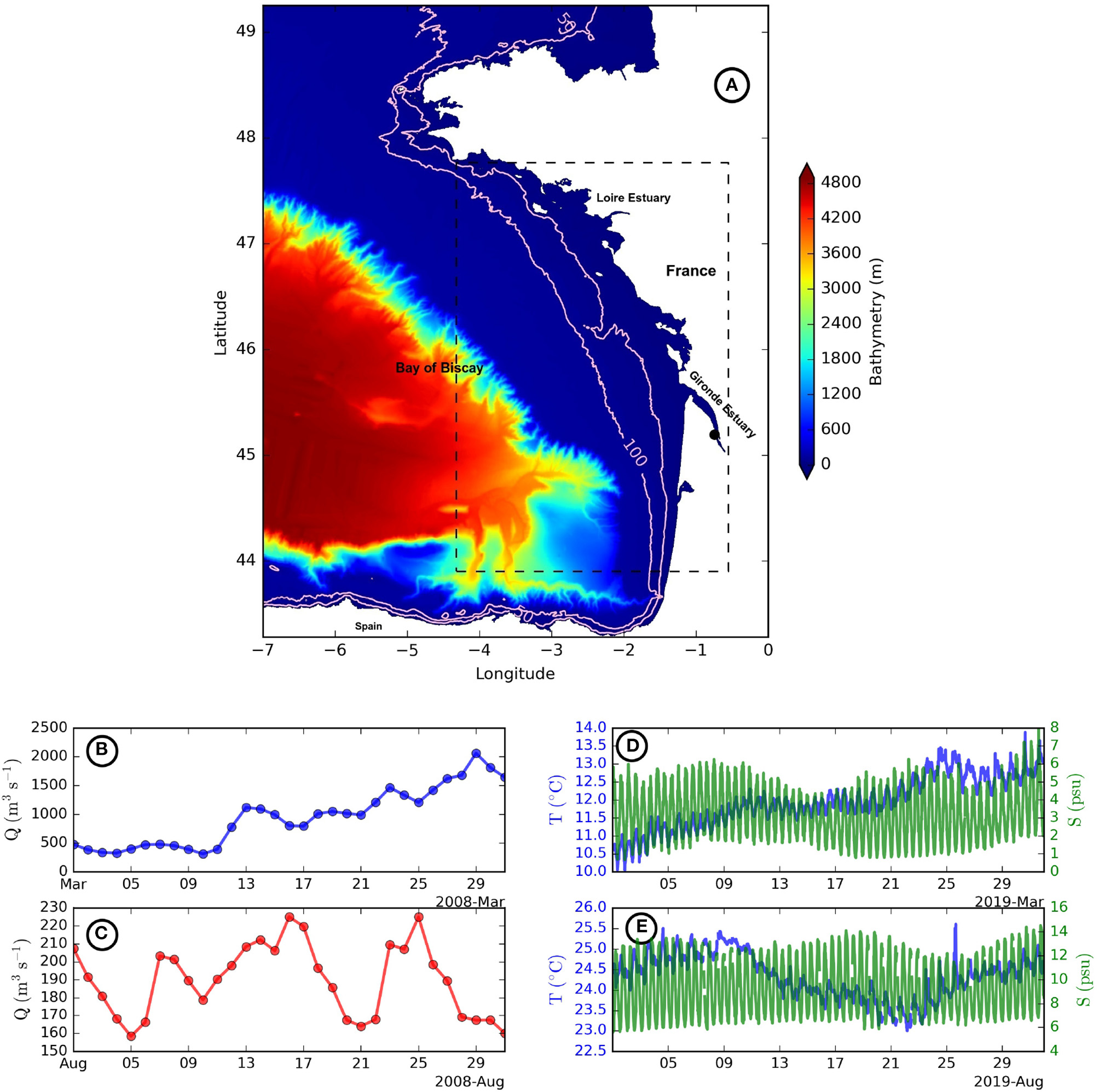 (A) Bathymetry of the Bay of Biscay used in numerical simulations; black dashed box limits the studied region; pink solid contours for the 50 and 100 m isobaths and the black dot in the estuary shows the Pauillac station. Daily values of the Gironde river discharge in March (B) and August (C). Time series of the temperature and salinity measured in the Gironde river estuary at the Pauillac station in March (D) and August (E).