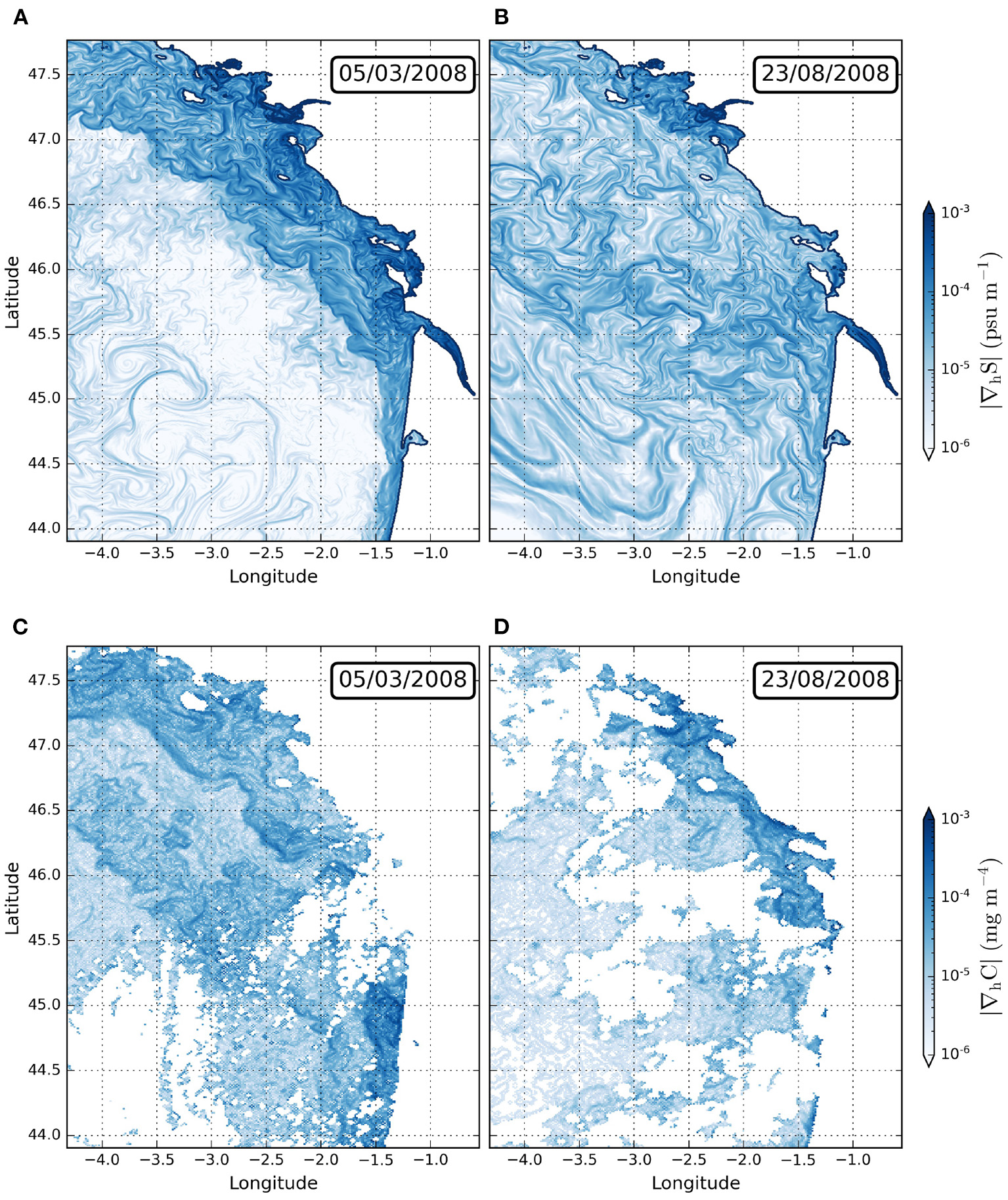 Figure 3 shows the horizontal salinity gradient and MODIS chlorophyll gradient in the studied region. The salinity gradient is mainly zonal as ∂xS > ∂yS. In March, salinity fronts are intense inside and outside of the Gironde estuary (Figure 3A). Near the Gironde river mouth, they remain close to the coast (longitude ~ 1.5°W). These fronts are more sensitive to the average river discharge. The river discharge also feeds the coastal current where salinity fronts are intense. In the Gironde river plume, the zonal salinity gradient is largest in the estuary since the river discharge is low in August (Figure 3B). In the near field, the Gironde river plume front remains close to the coast (longitude ~1.5°W). This plume extends to the north (up to a latitude ~46.5 °N) in the coastal current. Moderate winds and small river discharge constrict the coastal current near the coast. Beyond the river plume front, small scale filaments and eddies are observed.