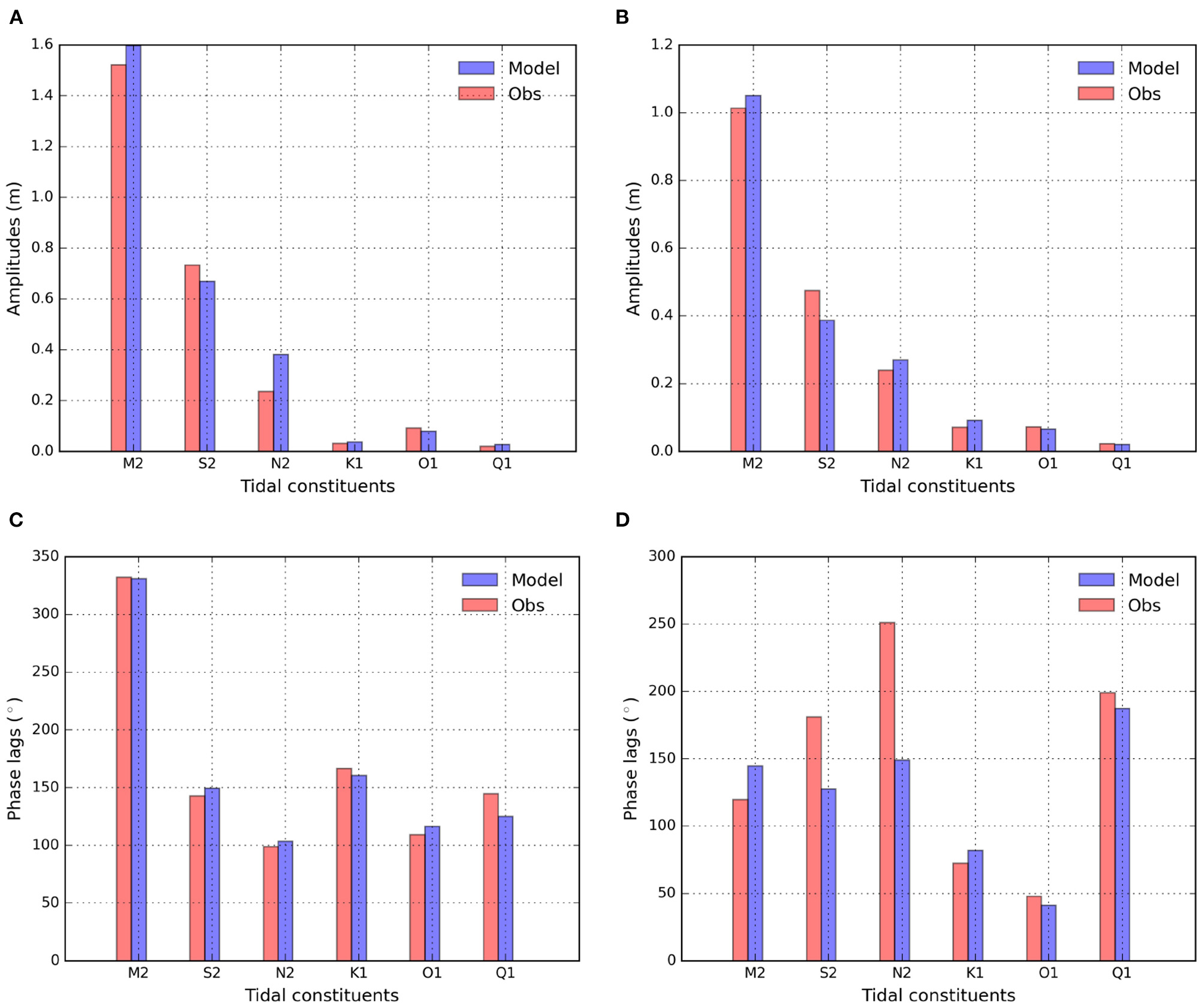 Statistics of the mean tide amplitudes in March (A) and in August (B) from numerical simulations (blue) and tide gauge observations (red); and the corresponding mean phase lags in March (C) and August (D) averaged using four tide gauges (see Table 1).