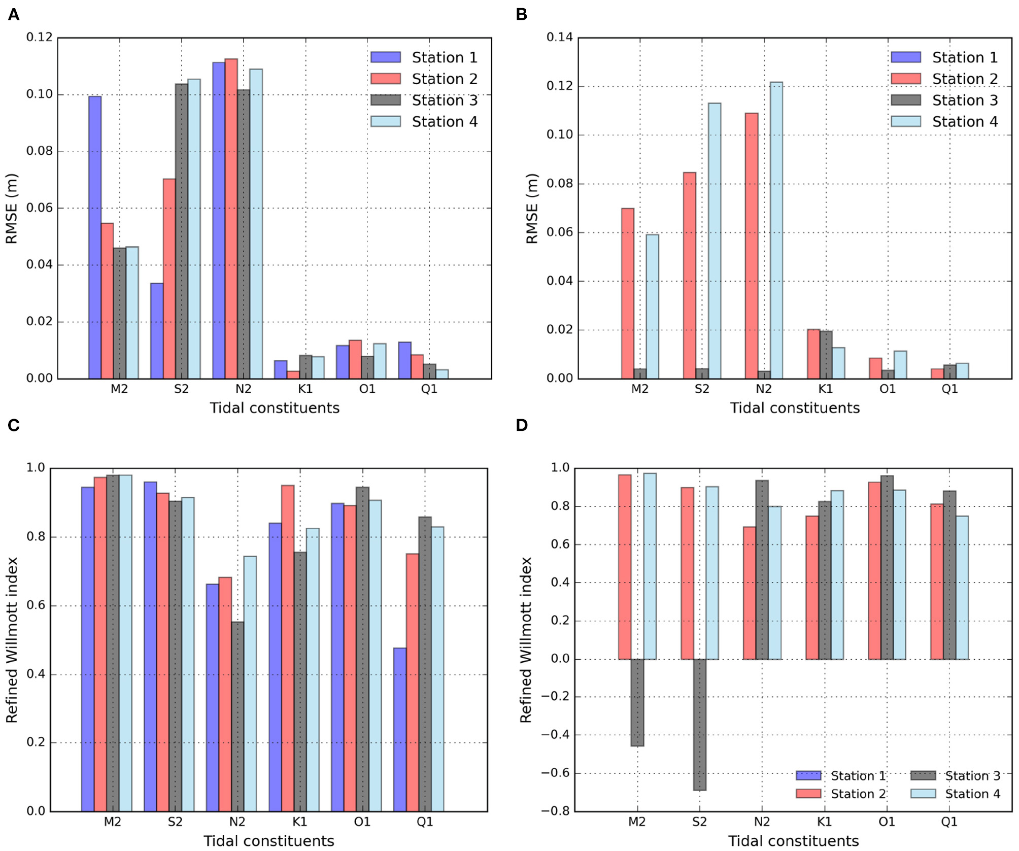 RMSE in March (A) and in August (B); and the refined Willmott index in March (C) and in August (D) between the modeled and observed Sea Surface Height anomaly for each station (detailed in Table 1) and M2, S2, N2, K1, O1, and Q1 tidal constituents.